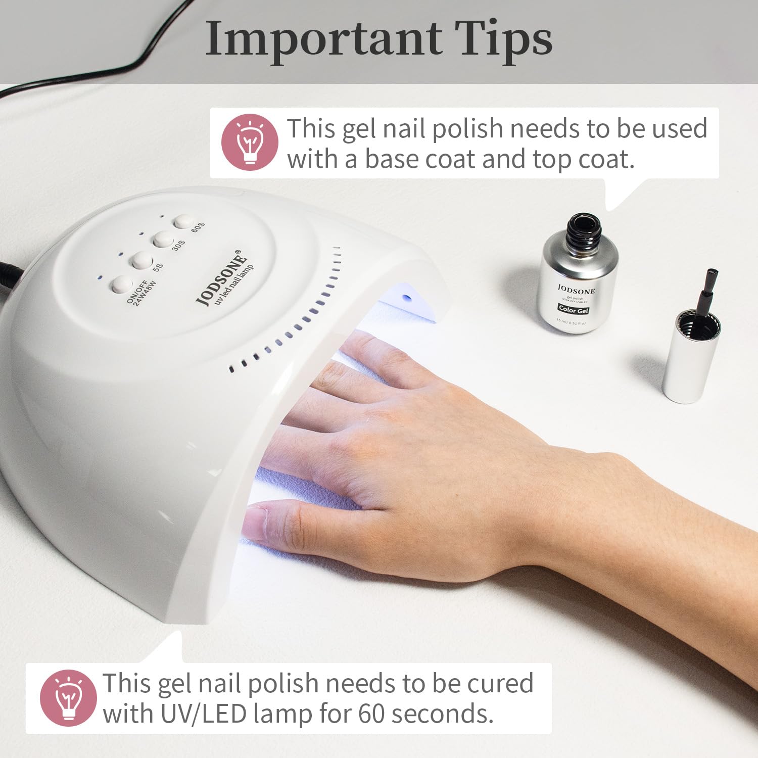 - Quick Cure With Led Nail Lights: Gel Nail Polish Kit requires curing under LED lights. Requires base coat and top coat.LED light averages 60-120 seconds.