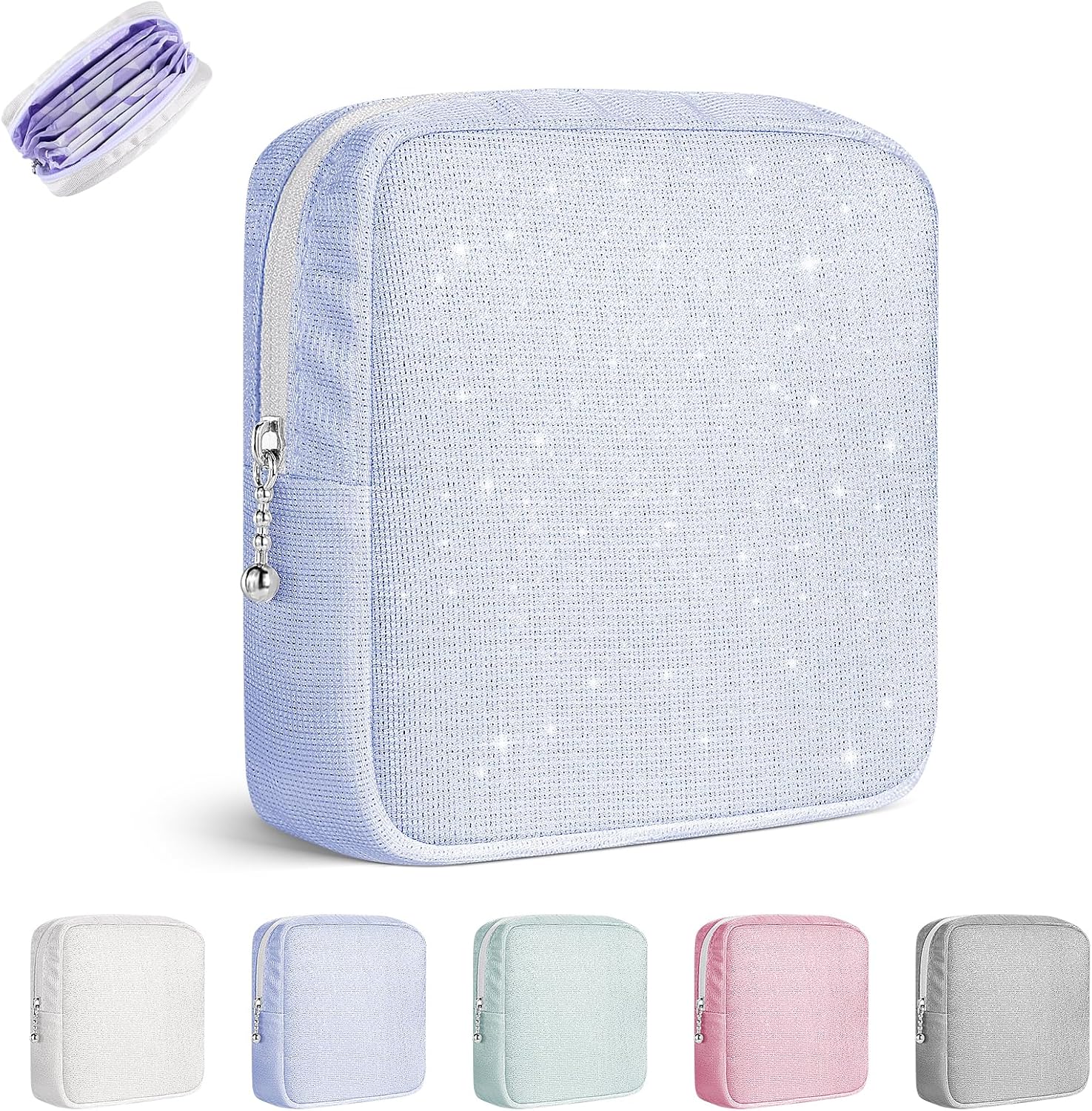 - 【Suitable Size】Measuring: 5.6*5.7*1.3 inches. Glitter sanitary napkin pouch can holds up to 10 normal size sanitary napkins and 4 tampons simultaneously. Whether you are at office, outdoors or traveling, the sanitary pad pouch can easily fit in your bag