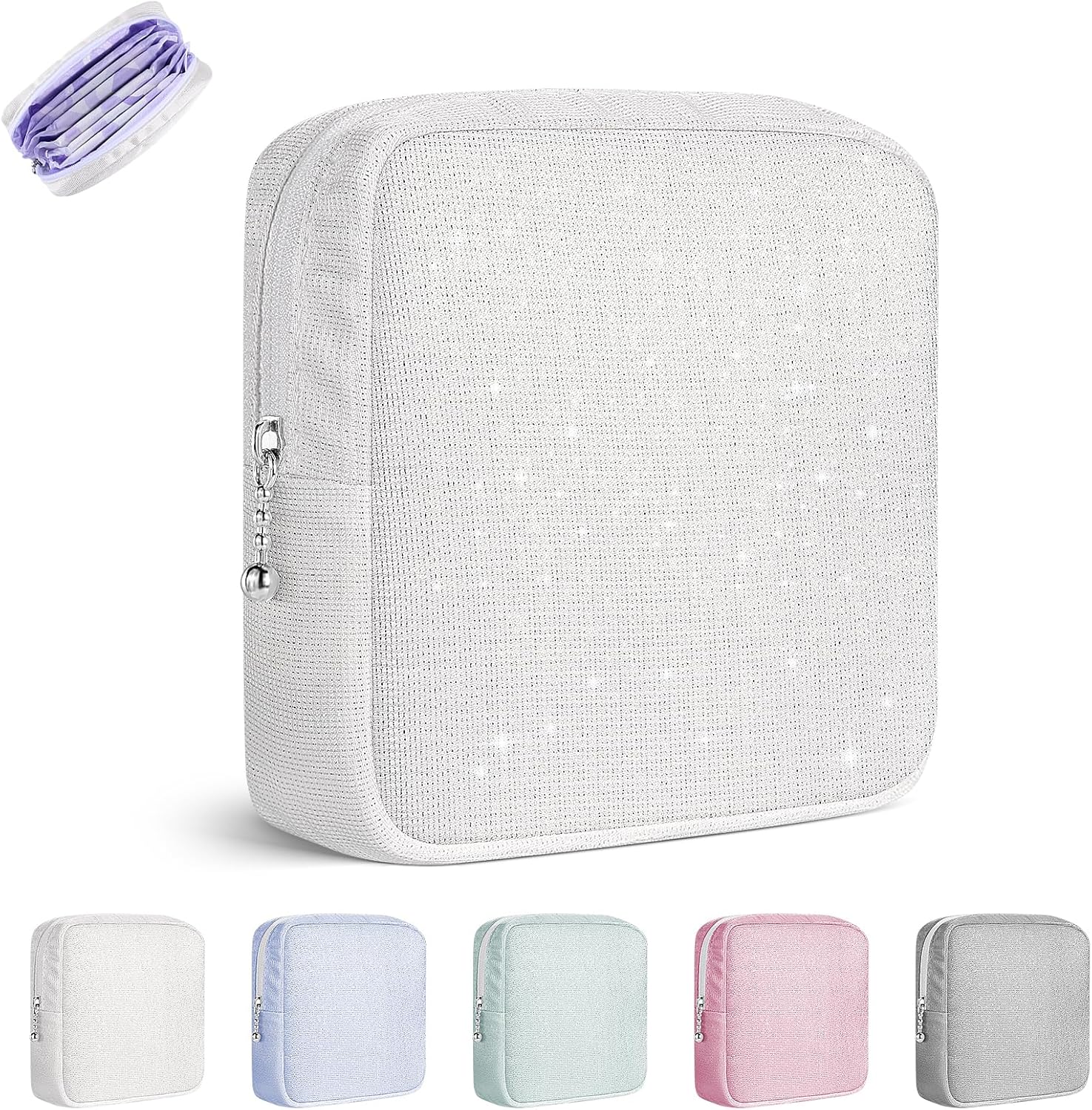 • 【Suitable Size】Measuring: 5.6*5.7*1.3 inches. Glitter sanitary napkin pouch can holds up to 10 normal size sanitary napkins and 4 tampons simultaneously. Whether you are at office, outdoors or traveling, the sanitary pad pouch can easily fit in your bag