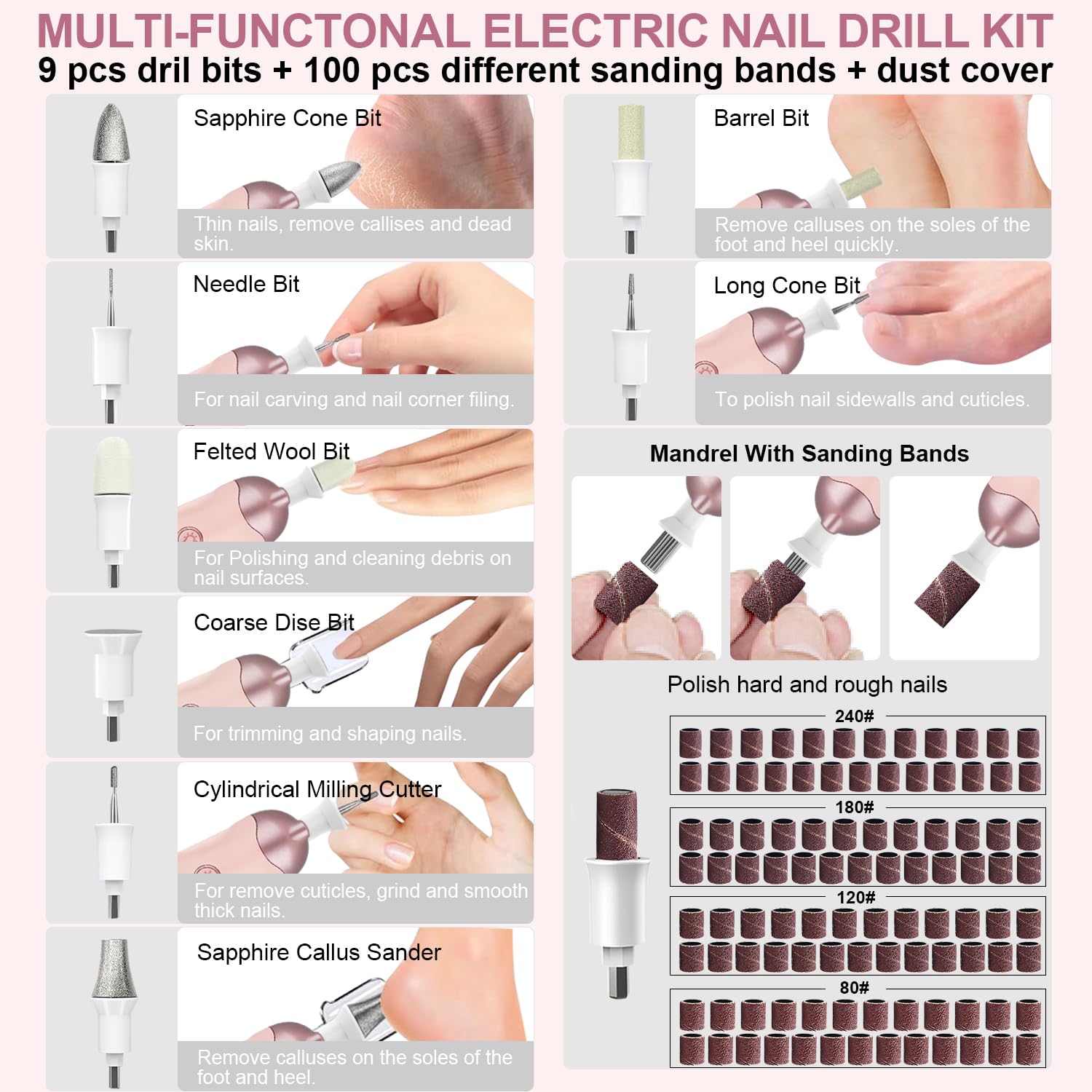 - Professional Manicure Pedicure Kit Meet All Your Necessary Hand and Foot Nail Care Needs--9 pcs Nail Bits & 100 pcs Different Sanding Bands: Karrong professional nail drill includes 9 different nail bits: Sapphire Cone Bit, Sapphire Callus Sander, Needle Bit, Felted Wool Bit, Long Cone Bit, Coarse Dise Bit, Cylindrical Milling Cutter, and Mandrel. Additionally, it comes with 100pcs sanding bands that are perfect for polishing hard and rough nails.