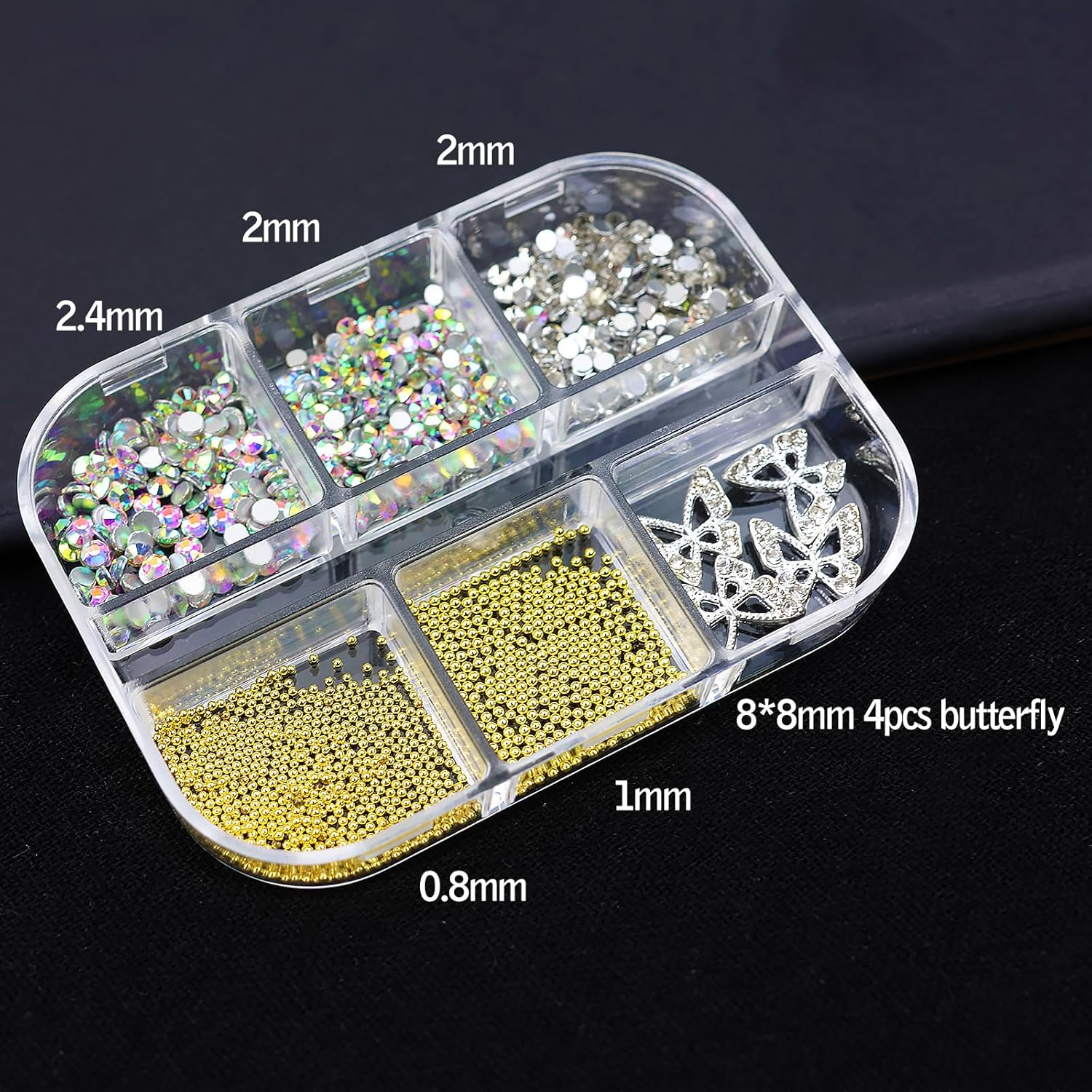 - 【Mix Nail Rhinestones】In another rhinestones box,there is mixing gold nail beads,AB color and white nail gems. There are 4pcs butterfly in small size,which you can apply on long acrylic nails or short nails.