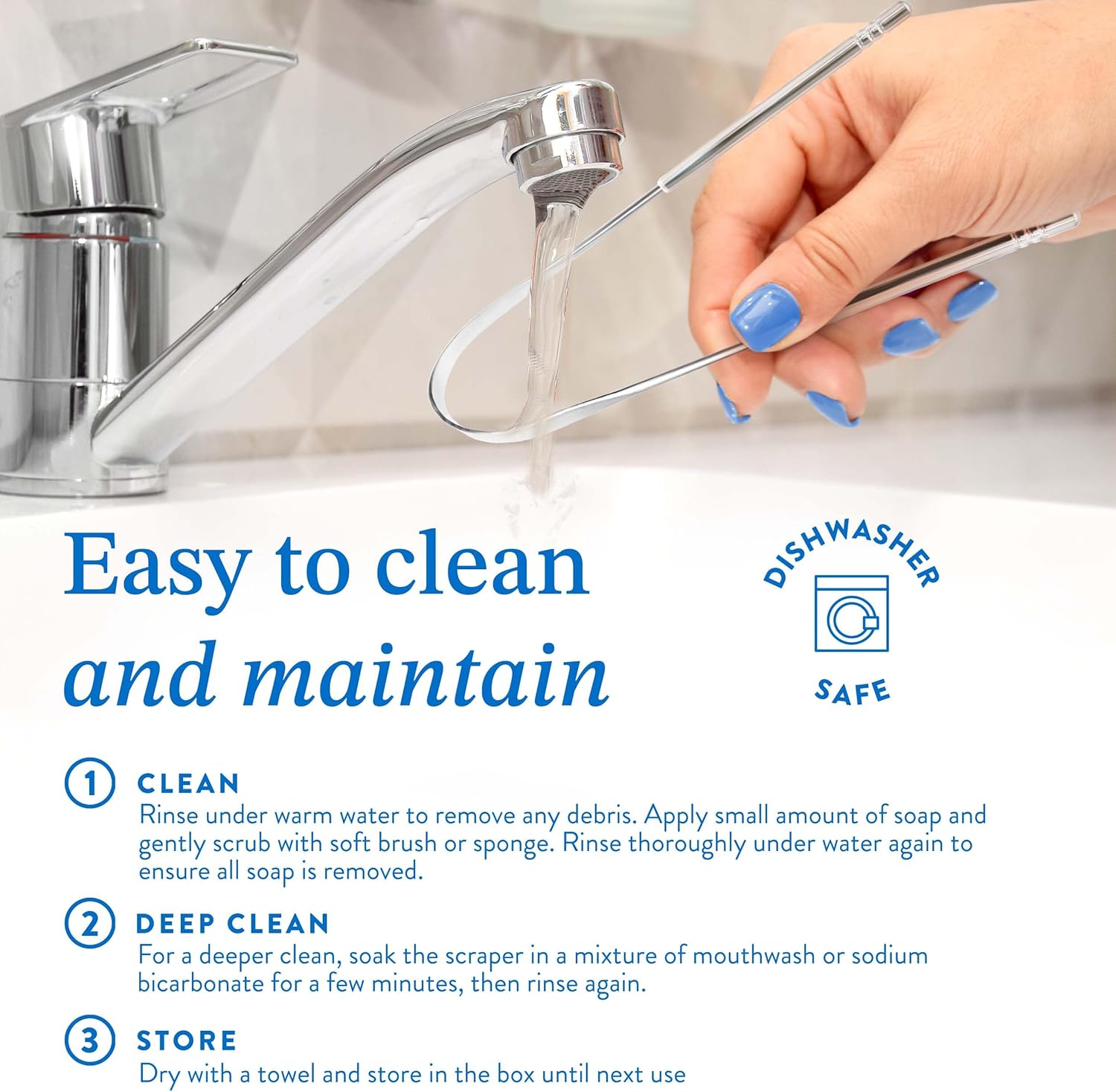 - EASY TO CLEAN & MAINTAIN: To clean your tongue scraper for adults, simply rinse off the tongue cleaner or submerge in water with a cleaning tablet or lemon water - then, remove the tounge scraper and dry thoroughly before storing in the included travel case. Unlike plastic tongue scraping tools, these tongue scrapers for adults are designed to be used again and again, leaving your tongue cleaner than ever before!