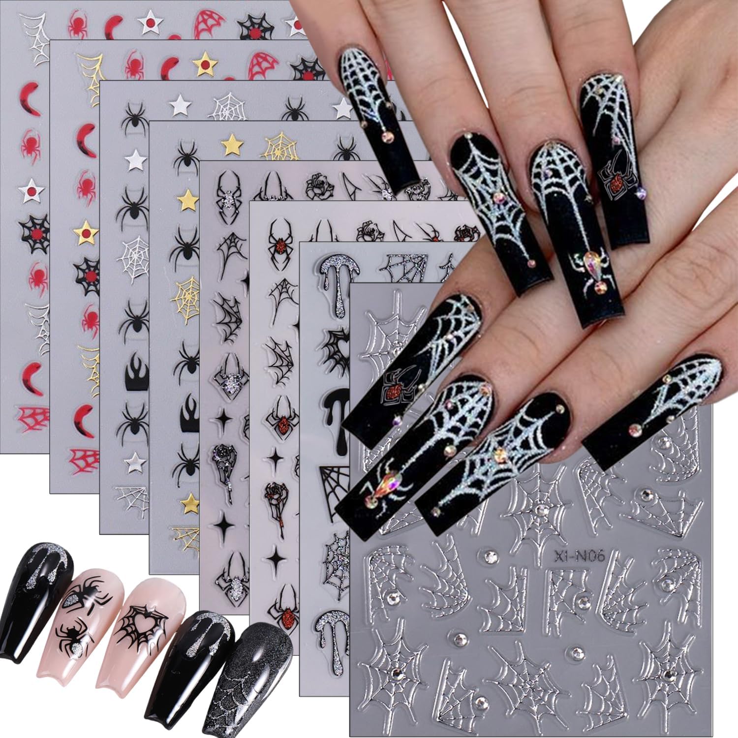 - 🎃Wide Occasions: Self-adhesive spider web with crystal diamonds nail design Halloween stickers are very suitable for decoration of your fingernails, not only for nail art decorations, 3d horror nail design stickers are also for decoration of your mobile phone cases, greeting cards, body art, etc. Suitable for home use and professional nail salon.