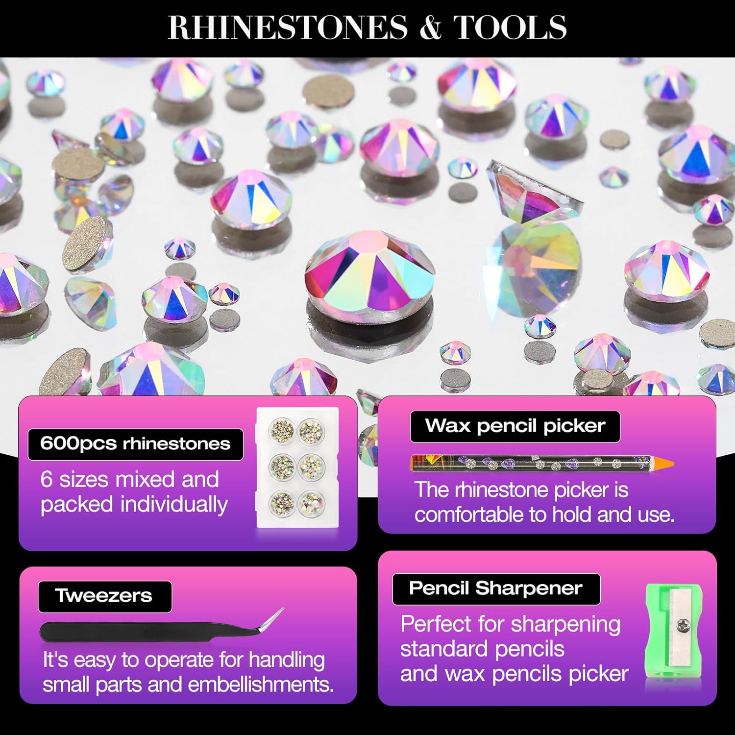 - Rhinestones: Pack of 600 Pieces Crystal AB Rhinestones, mixed 6 sizes, SS12 (3.0-3.2mm), SS16 (3.8-4.0mm), SS20 (4.6-4.8mm), SS30 (6.4-6.6mm), SS34 (7.1-7.3mm), SS40 (8.3-8.6mm).