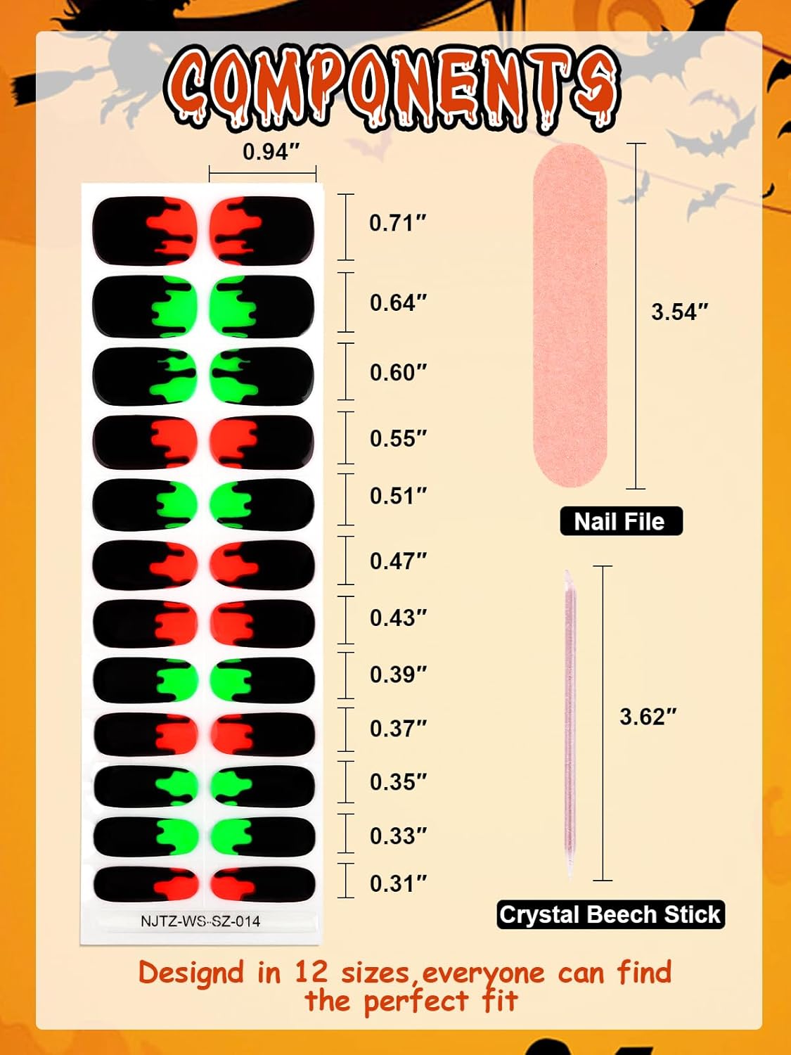 - Halloween Nail Decals: The package contains 24pcs easy-to-use gel nail polish wraps. There are 12 sizes available in different sizes with 1 nail file and 1 nail stick. They are flexible and can be matched with any nail size and adjusted according to the shape, so they are wearable for different nail shapes.