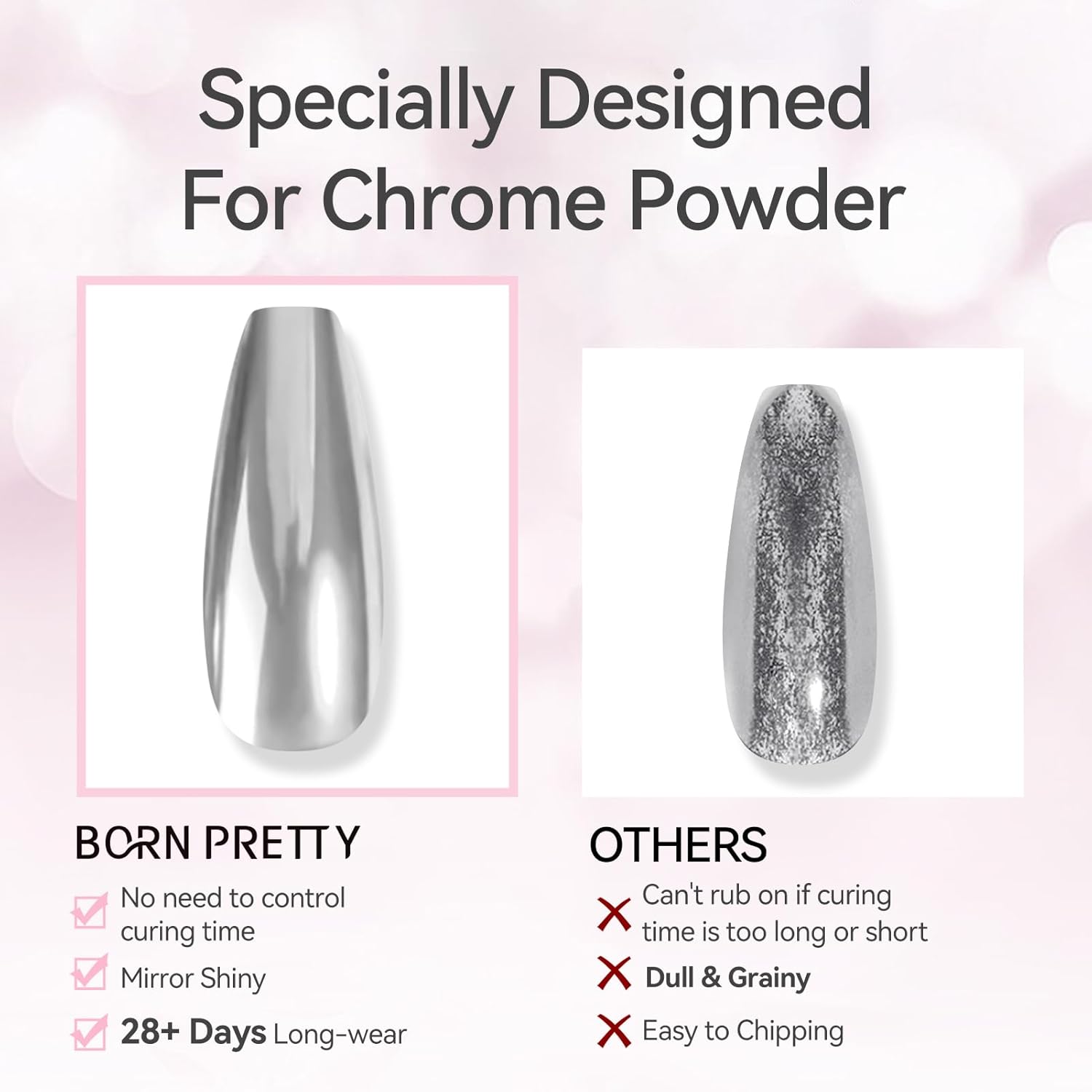 - BORN PRETTY Nail Top Coat Advantage: It is designed to synergize effortlessly with chrome nail powder, guaranteeing impeccable results regardless of curing duration. In contrast, it becomes problematic when applying the chrome powder with regular topcoats if cured for over 30 seconds.