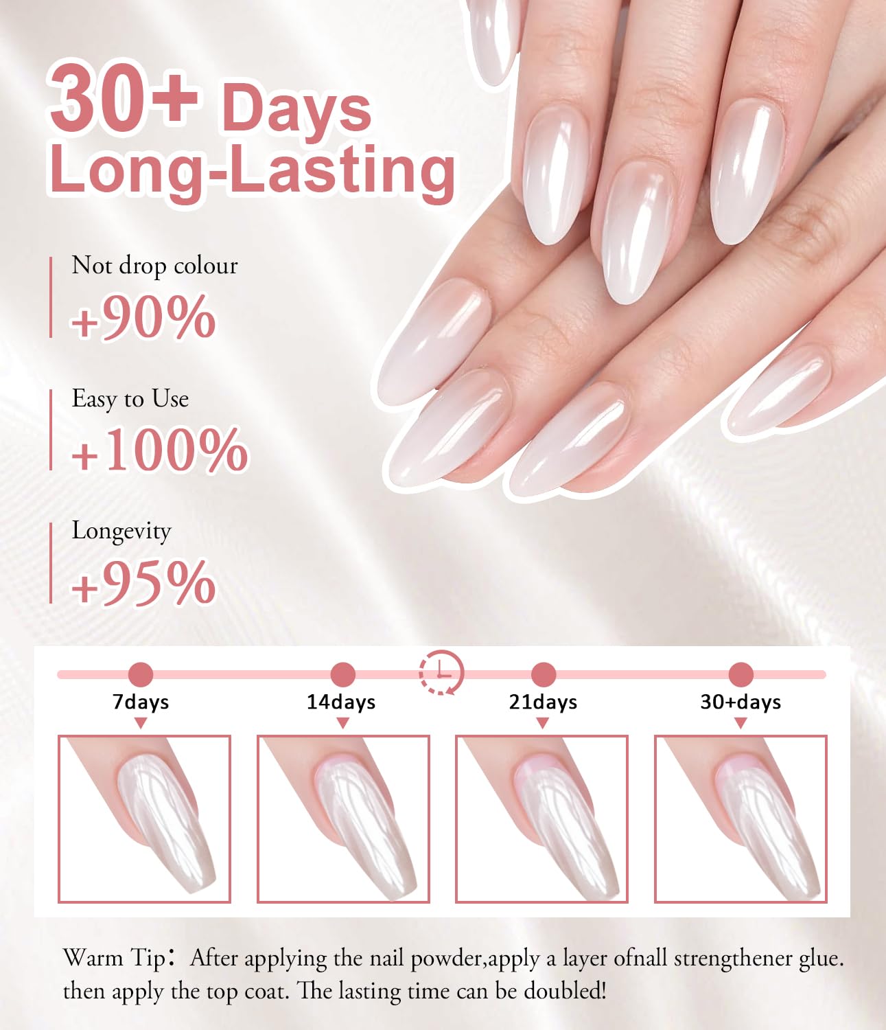 - Ultra Excellent Texture: BISHENGYF white pearl chrome nail powder is super fine in texture, without particles feeling with attractive luster, which can be applied effortlessly in just 2-3mins. And it doesn't get messy when you're using it, resulting in glitter everywhere!
