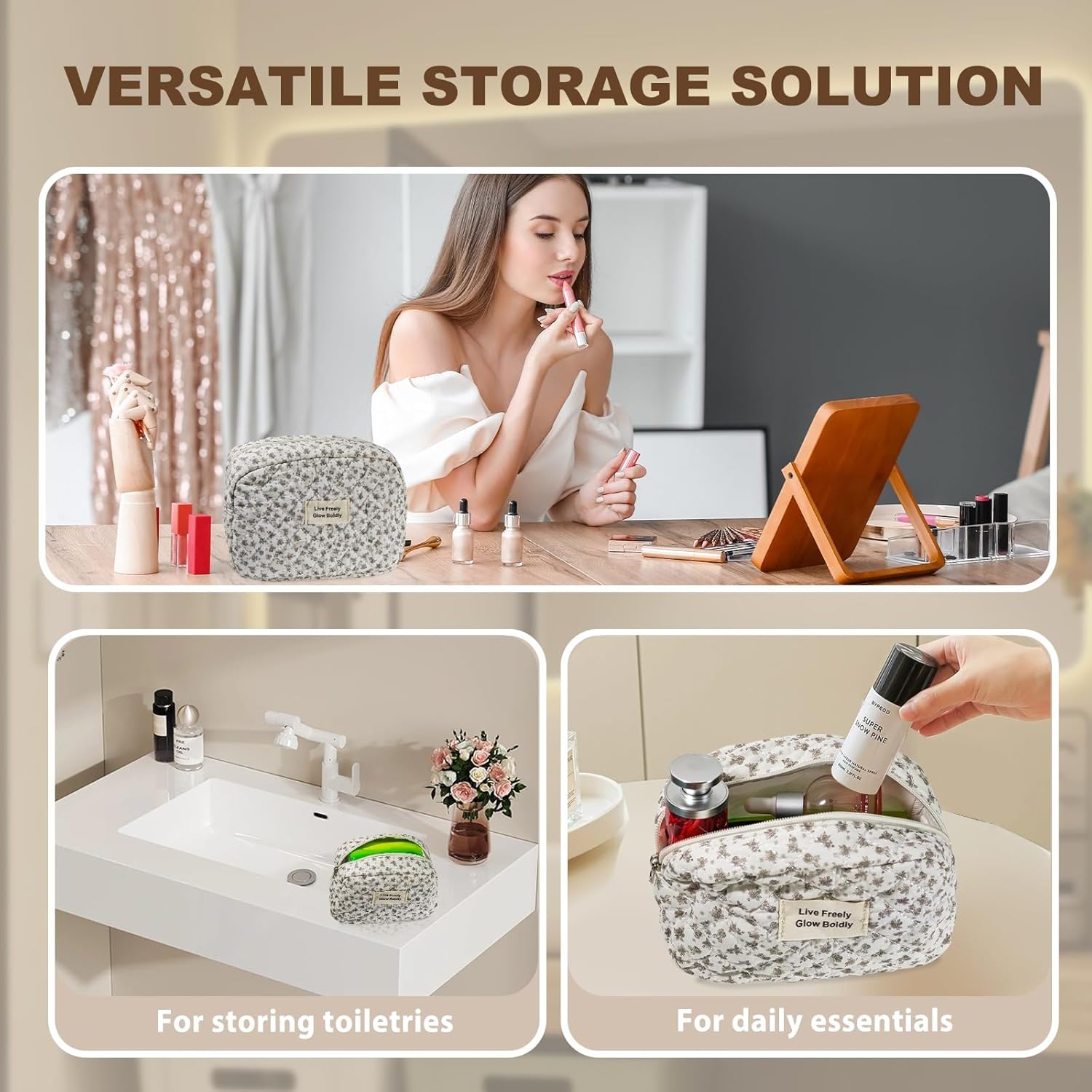 - Set of 3 Pieces: The set includes three cosmetic bags in varying sizes for versatile use.. T9.45×7.10×6.30 inches, 9.45×6.70×3.55 inches, and 7.85×5.50×3.15 inches respectively, our cute quilted makeup bags are perfectly sized for portability.