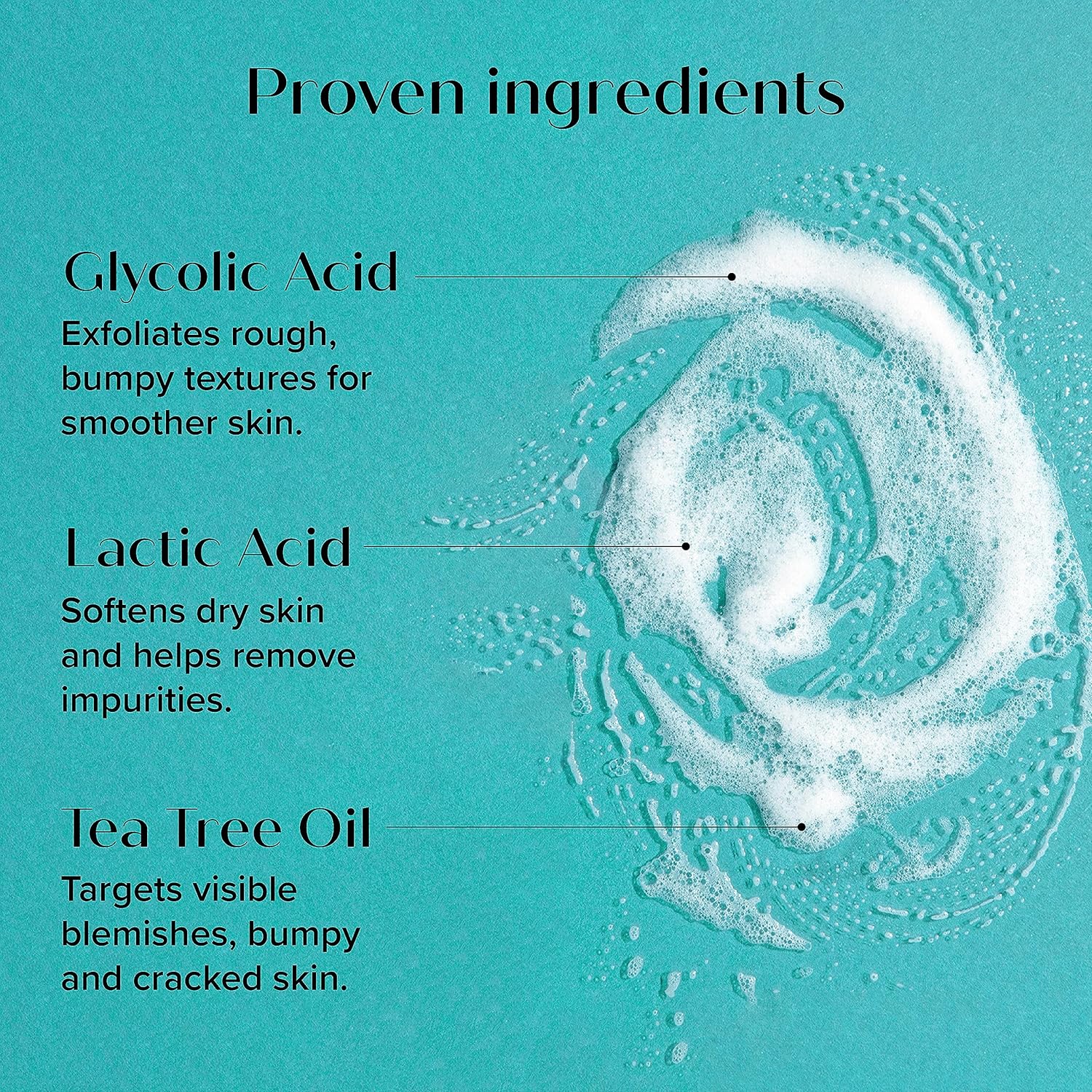 - SMOOTHING CLEANSE: Our glycolic acid body wash exfoliates and resurfaces rough and bumpy texture to reveal softer, smoother skin. The Alpha Hydroxy Acids within this exfoliating body wash prepares your skin for treatment body creams/lotions to effectively be applied by helping to remove the dry, dull skin that builds up on the surface of our skin. Dry skin can act like a shield that prevents active ingredients from penetrating.