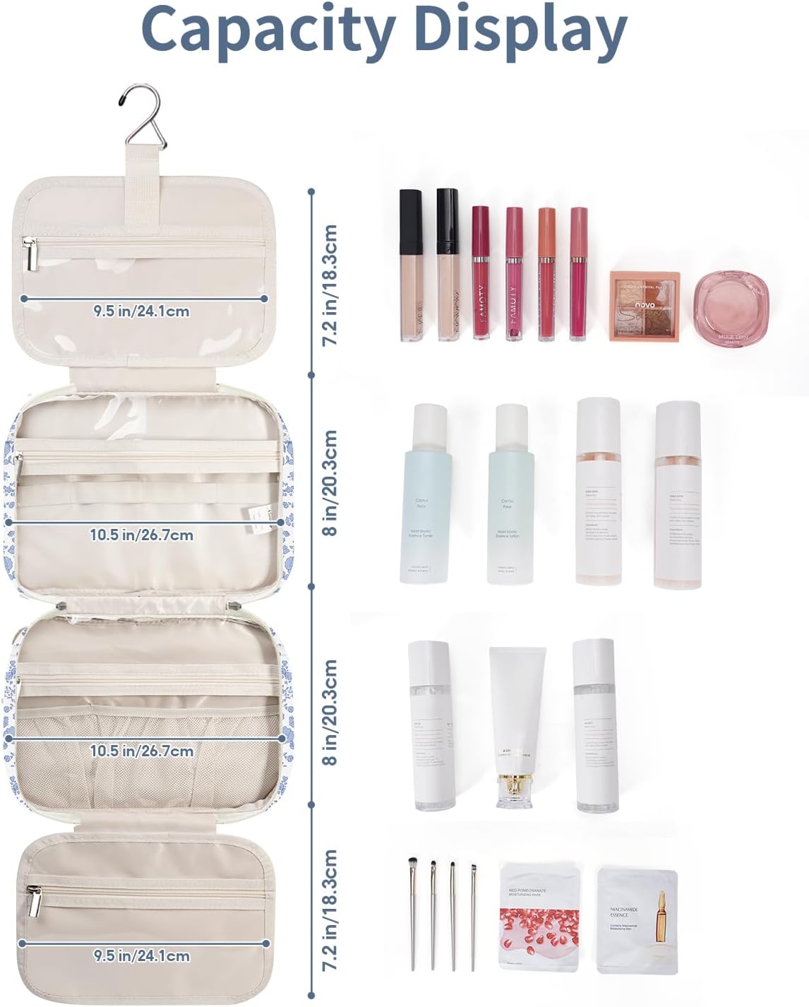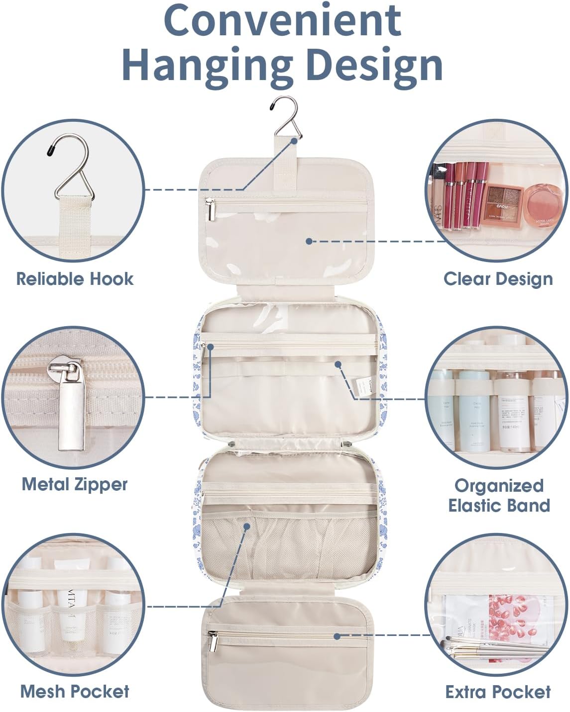 - NOT BULKY DESIGN - Large Capacity yet compact design, weighing 14 ounces. large metal hook allows hanging the toiletry case from towel rack, coat hook or whereever is available, making your toiletries and cosmetics displayed well for easy access