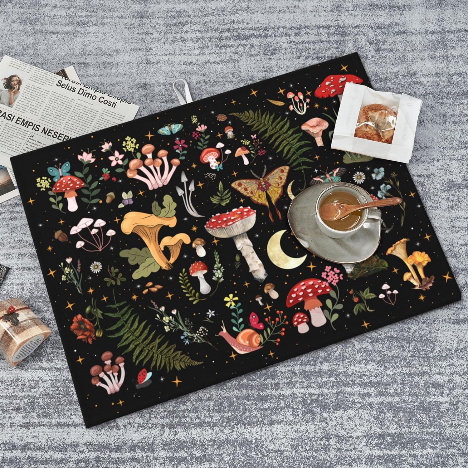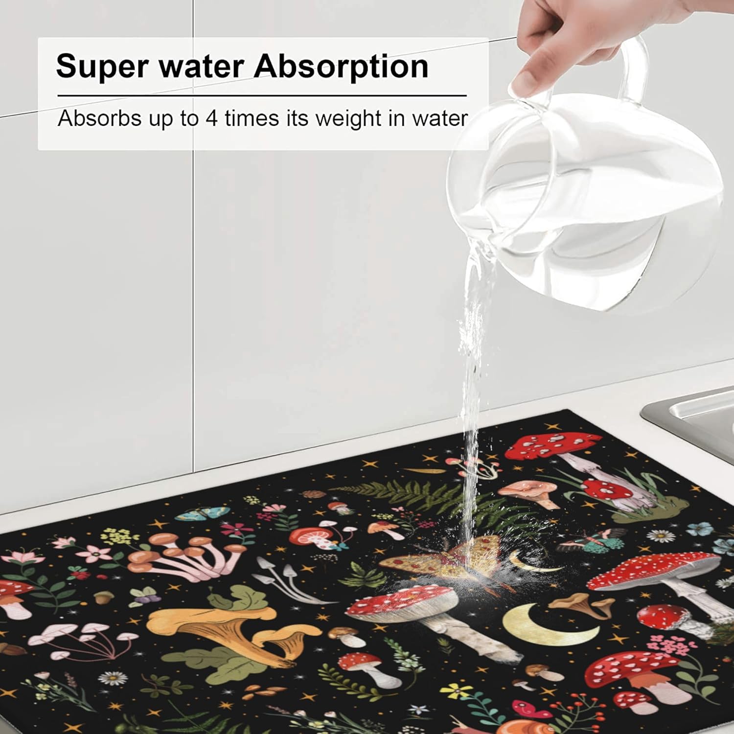 Mushroom Dish Drying Mat for Kitchen Counter 18"x24" Moth Gothic Witchy Dishes Pad Dish Drainer Rack Mats Microfiber Washable Absorbent Kitchen Decor, Black