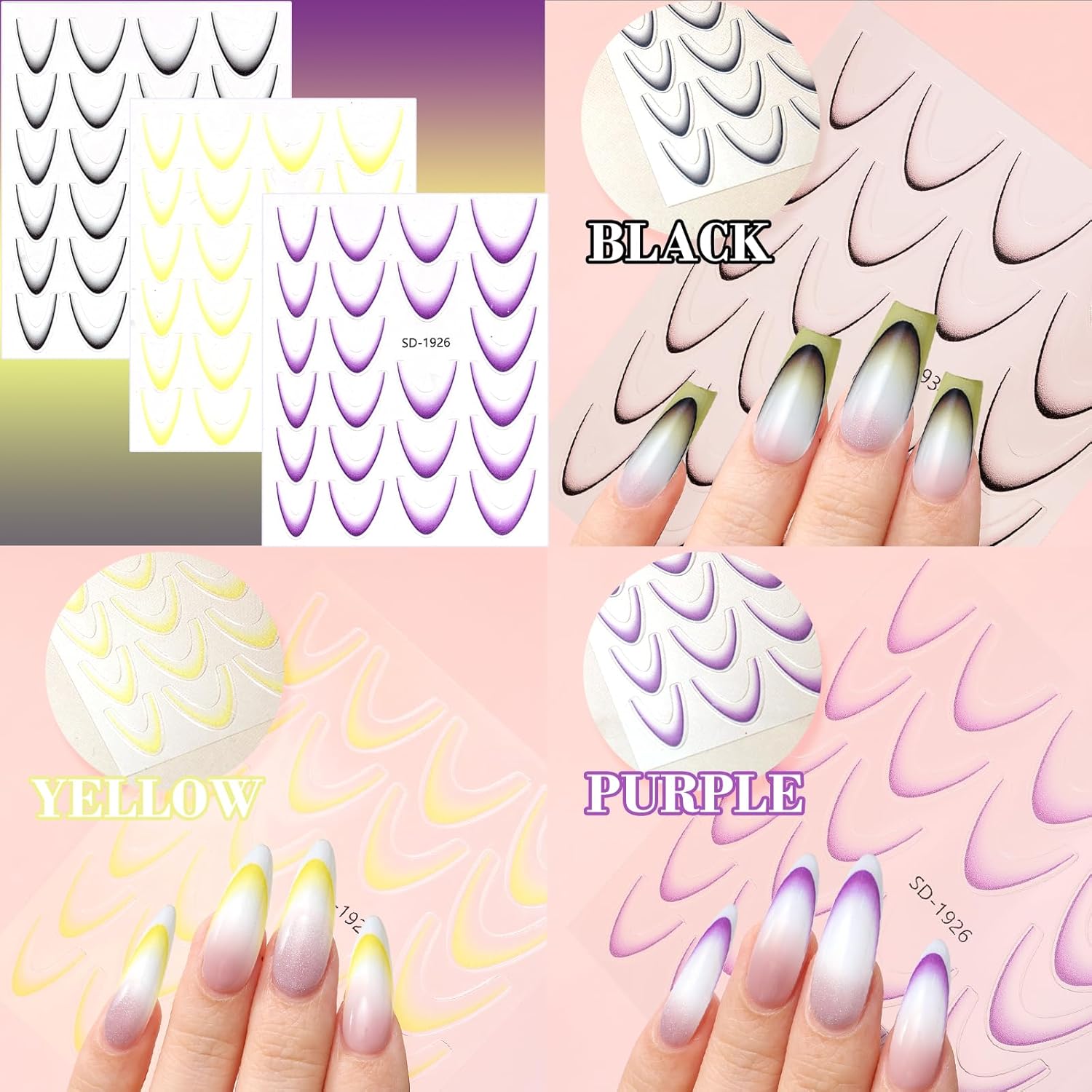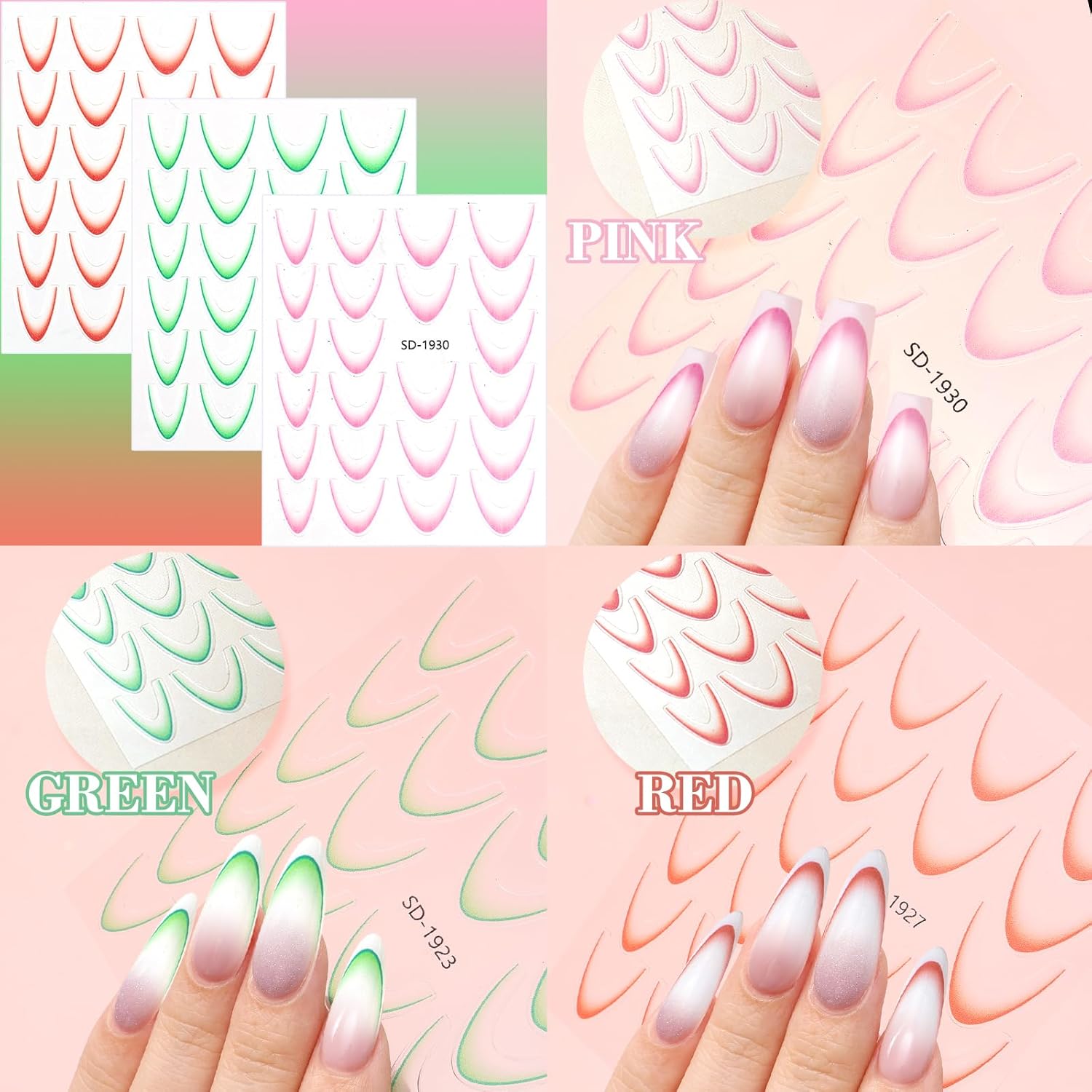 - 【3D Gradient French Tip Stickers】You will receive 9 sheets 3D French nail stickers in different colors, each with French line patterns of different sizes. Gradient French nail stickers and decal stripe designs combine popular elements, with simple design and rich colors, enough to satisfy your various French nail designs.