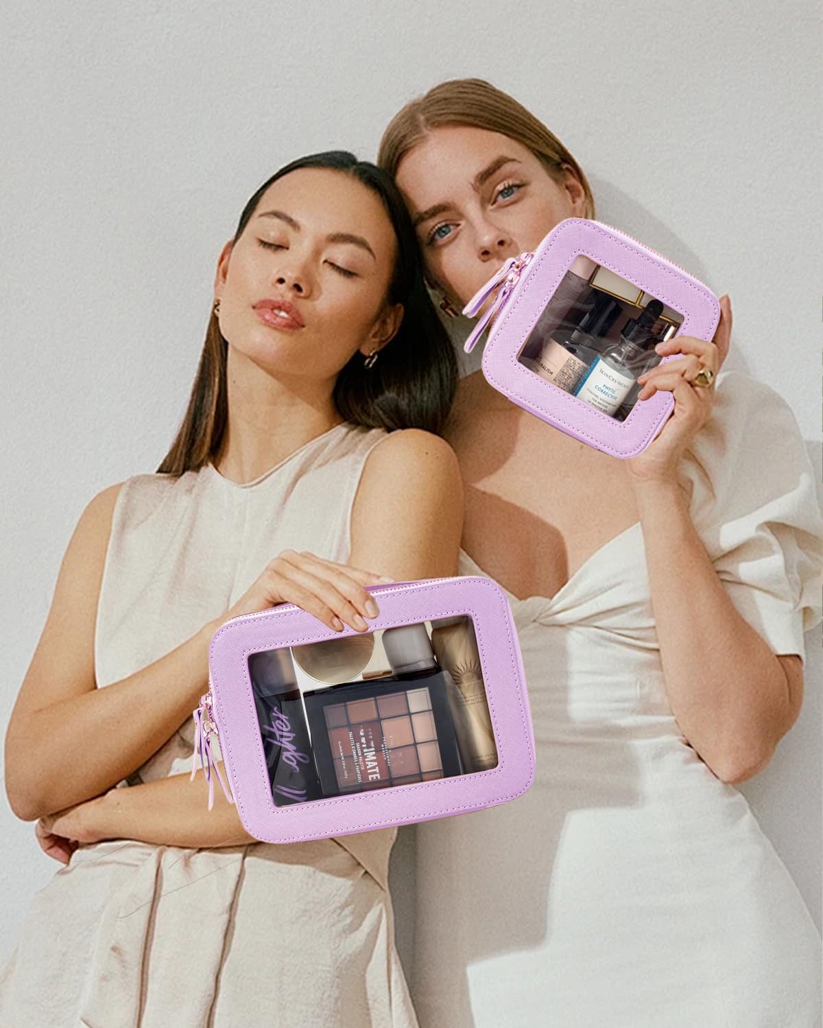 • Clear Design: Our 2Pcs Travel Makeup Bag is elegant ,and stylish, this makeup travel organizer was designed in a minimalist boxy shape,is sleek and minimalistic look for your makeup accessories collection. And is designed with a transparent PVC window,all items are clear at a glance, and you can quickly choose the cosmetics you need.Portable and lightweight Slip it into your purse, backpack, everyday tote or travelling bag for easy access to your must-have items. Large Size:8.1'' x 6.1'' x2.5'', Mini Size:5.1'' x 4.8''x 2''.