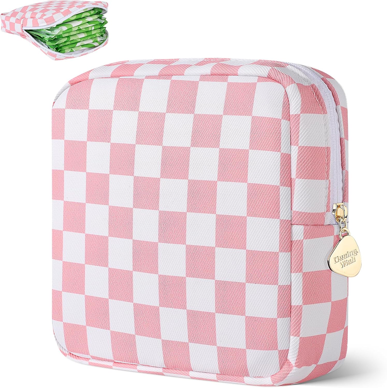 Desing Wish Sanitary Pad Storage Bag Portable Period Bag for Teen Pads/Sanitary Napkins/Small Tampons, Sanitary Napkin Storage Bag First Period Gifts for Teen Girls (Pink-White Checker)