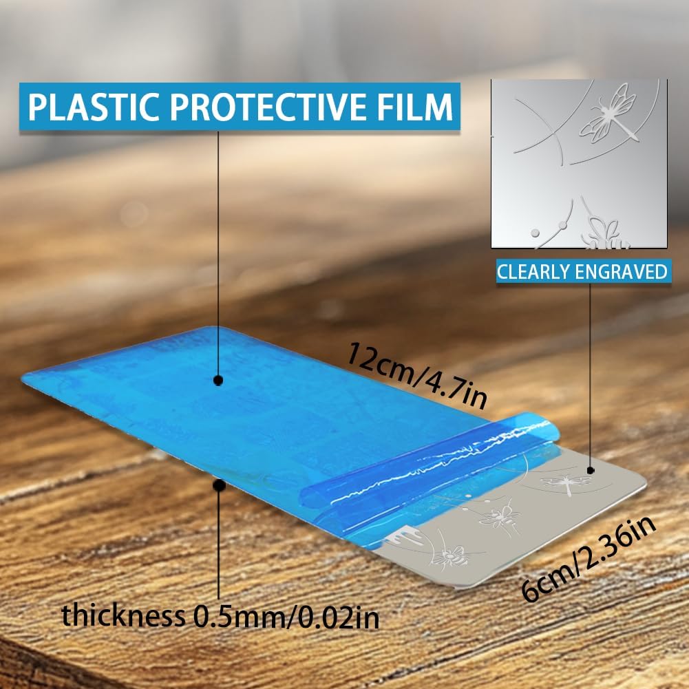 - Metal Material: Made of thick steel plate, not easy to fade, rust, steel plate surface with blue protective film to prevent scratches, clear lines, meticulous workmanship, different base colors present different effects. Size: 4.7Ă—2.36inch