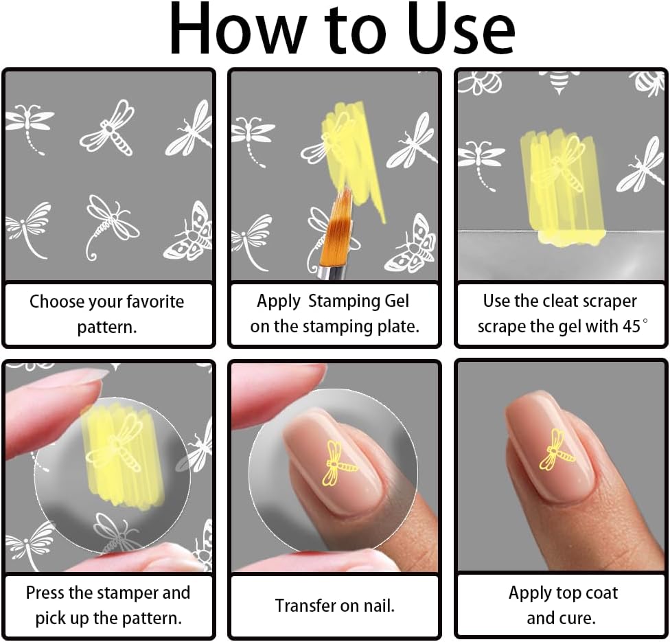 - Easy to Use: 1. Apply paint adhesive to the stencil, then use a scraper to quickly scrape off the excess 2.Use a silicone stamper to press down on the transfer pattern 3. Quickly transfer the pattern onto your nails 4.Bake dry to apply sealer then shine the lamp