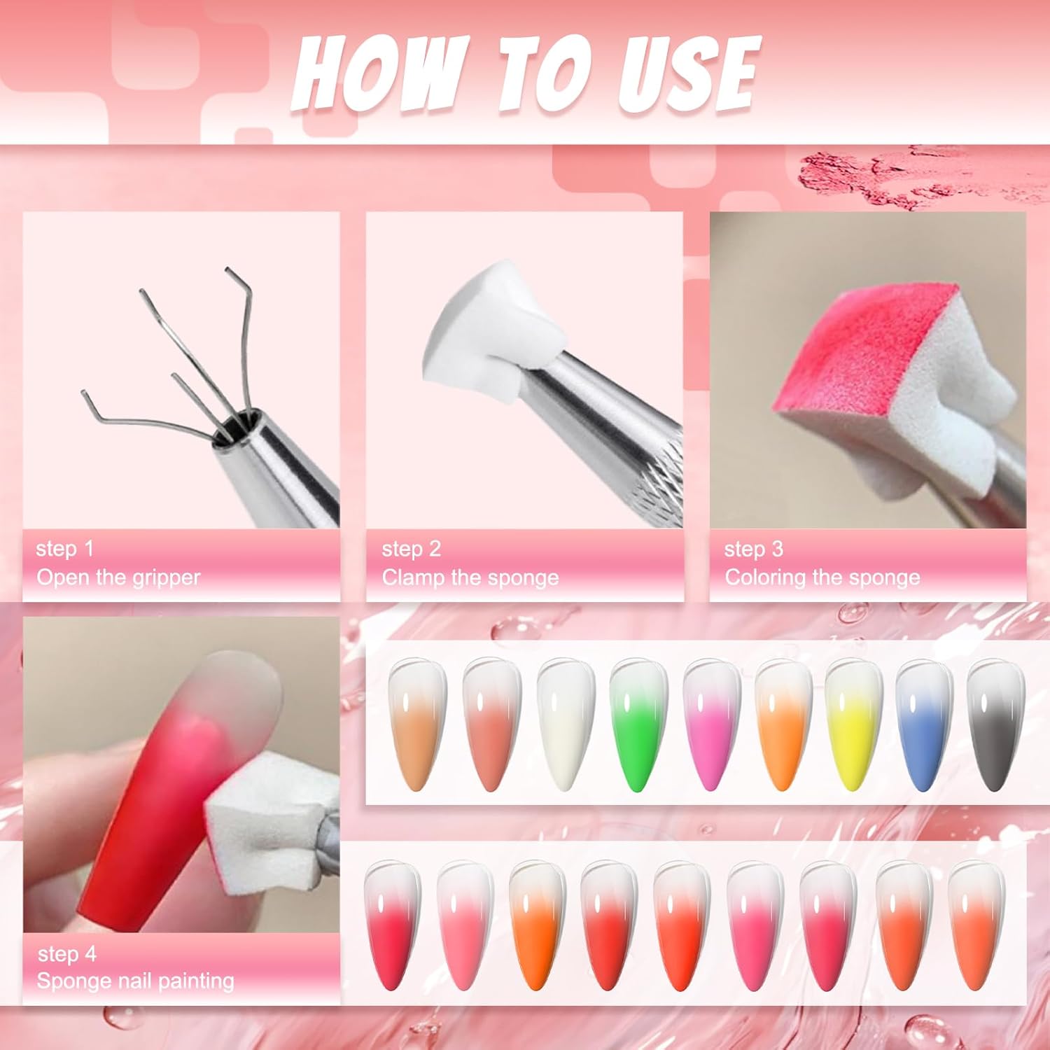- 【Steps to Use the Nail Pen】Just press the top of the pen, and the retractable claw inside the pen will extend and tightly grasp the nail sponge and use it as a handle pen. The retractable claw is about 16mm. This pen can prevent your nails from getting dirty when creating gradient nail designs.