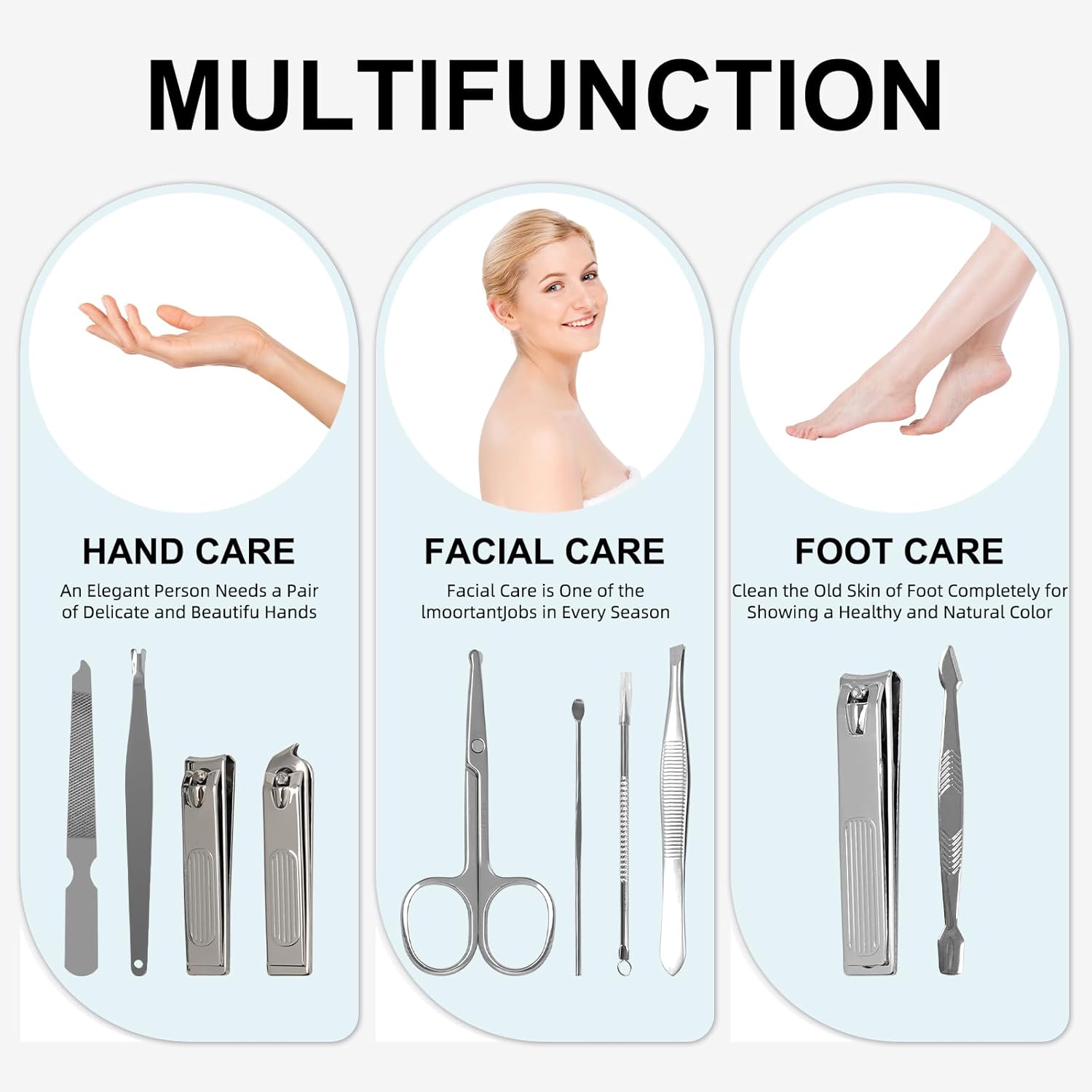 - 【Manicure Set】: A travel essential, the professional manicure set contains 10 pieces of personal care tools that can achieve three functions including hand care, foot care and facial care. Used for manicure, pedicure, eyebrow shaping, anti-acne, exfoliation. It can meet all your needs in a palm-sized storage box