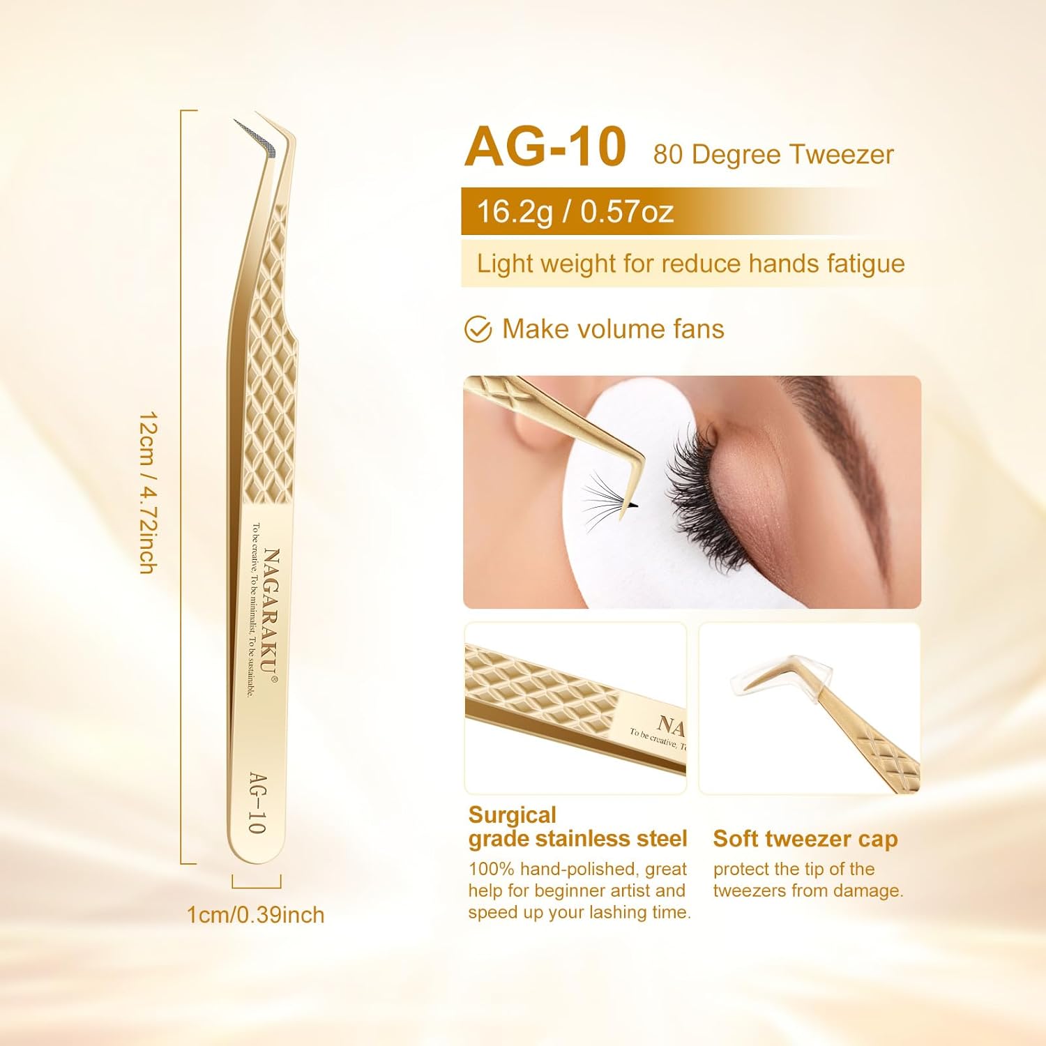 NAGARAKU Precision Fiber Tip Tweezer for Eyelash Extensions Diamond Grip Anti-Static Anti-Slip Premium Stainless Steel Pointed Volume Eyelashes Boot Tweezers Supplies with Box(80 Degree Tweezer AG-10)