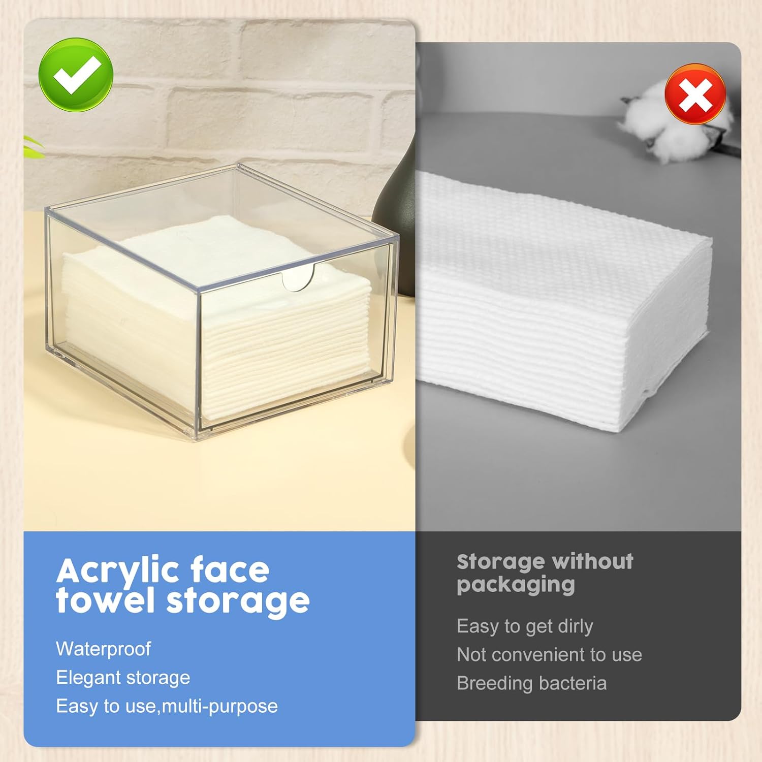 Rainmae Disposable Face Towel Holder, Face Towel Storage Box Bin, Stackable Clear Makeup Organizer with Drawer for Clean Skin Club Face XL Towels Holder for Vanity Bathroom and Makeup Organization