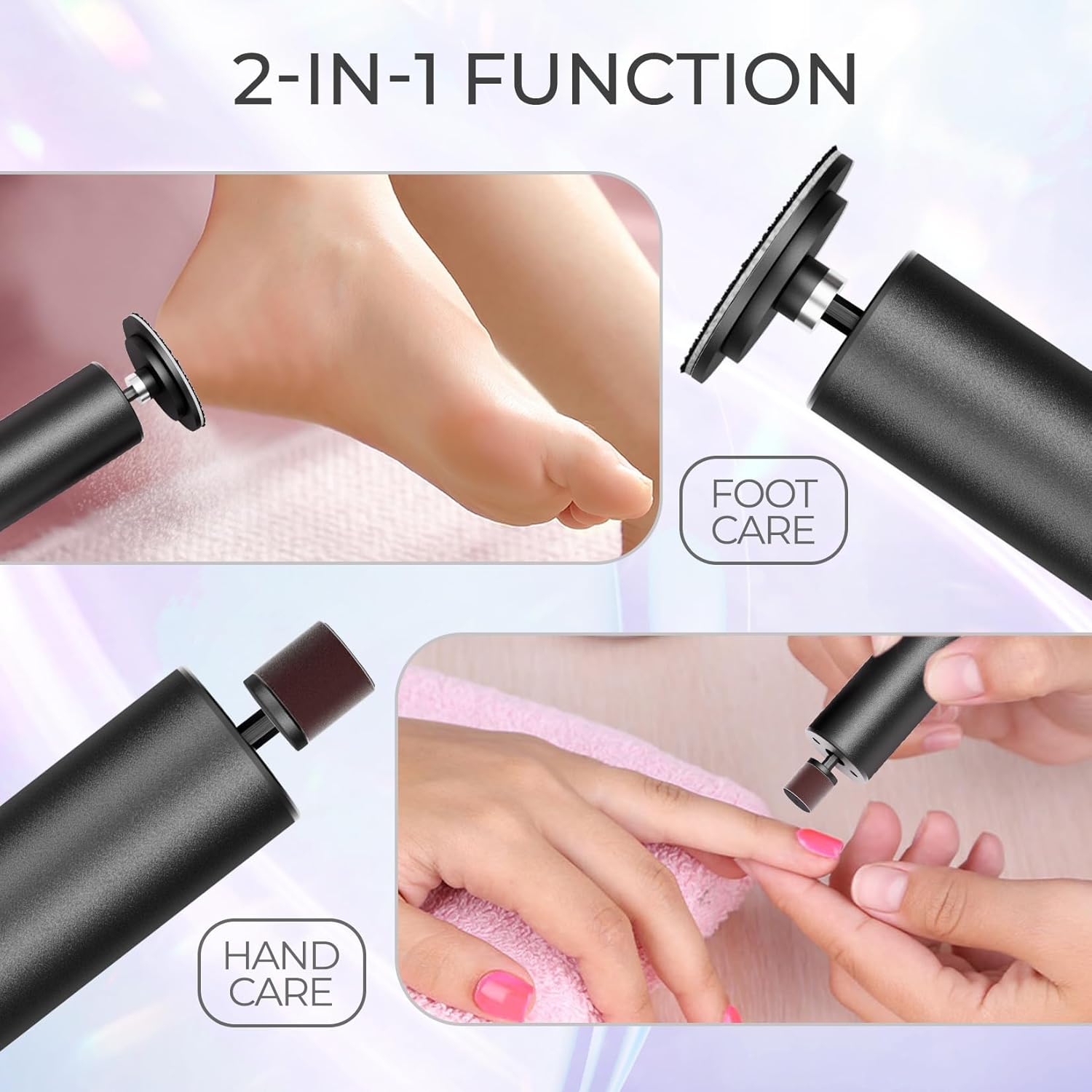 - Special 2 in 1 - krofaue electric callus remover(3.7kg torque) combines two functions of foot grinding & manicure. Our electric foot file adopts two buttons design, the first button long press to switch on and off - click to adjust 6 gears speeds (630RPM to 860RPM), the second button to adjust forward and reverse. Our electric foot grinder will automatically stop after 15 minutes of continuous use and requires you to long press the switch again to turn it on.