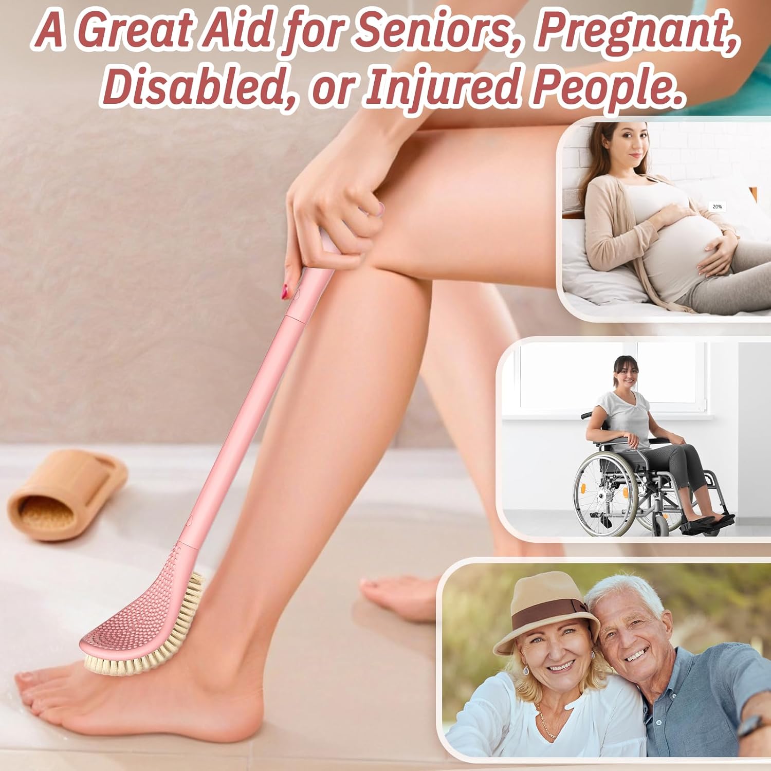New Foot Brush & Silicone Body Scrubber Set(2PCS), 3-in-1 Foot Scrubber with Extra-Long Handle, 10.2’’-27.5’’Adjustable Feet Scrub Brush and Silicone Loofah, Gift-Box Packed(Pink+Loofah)