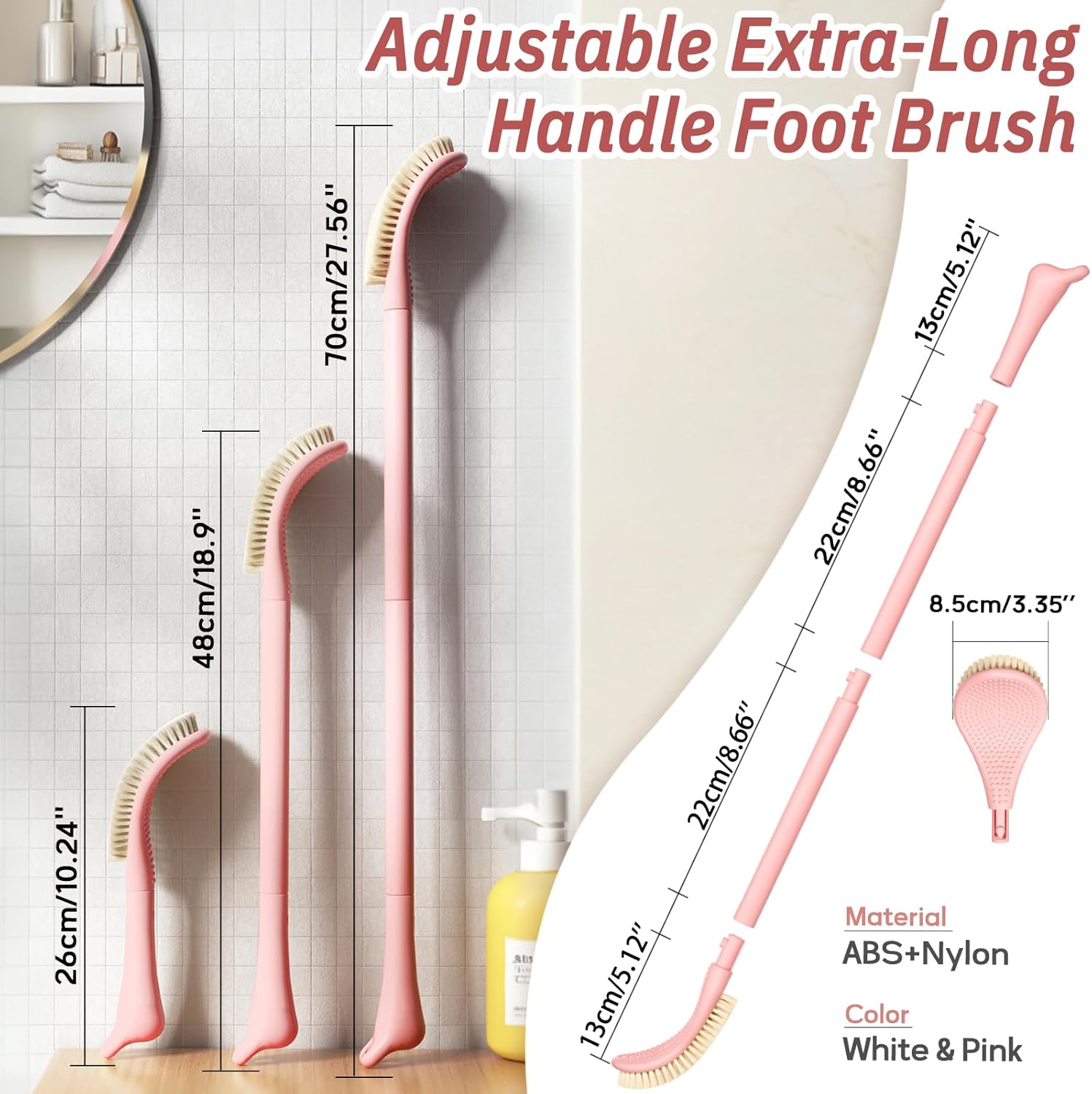 - 【Adjustable 3-in-1 Handle & Ergonomic Brush Head】Foot scrubber handle can be adjusted to three different lengths to meet different needs. Shortest one is perfect for hand-hold brushing, medium one for scrubbing legs and popliteal fossa areas, longest one for brushing feet and toes without bending. Curved angle of the brush head suits your feet and legs’ curved shape perfectly. It will go deep down to clean those areas much better than flat brushes.