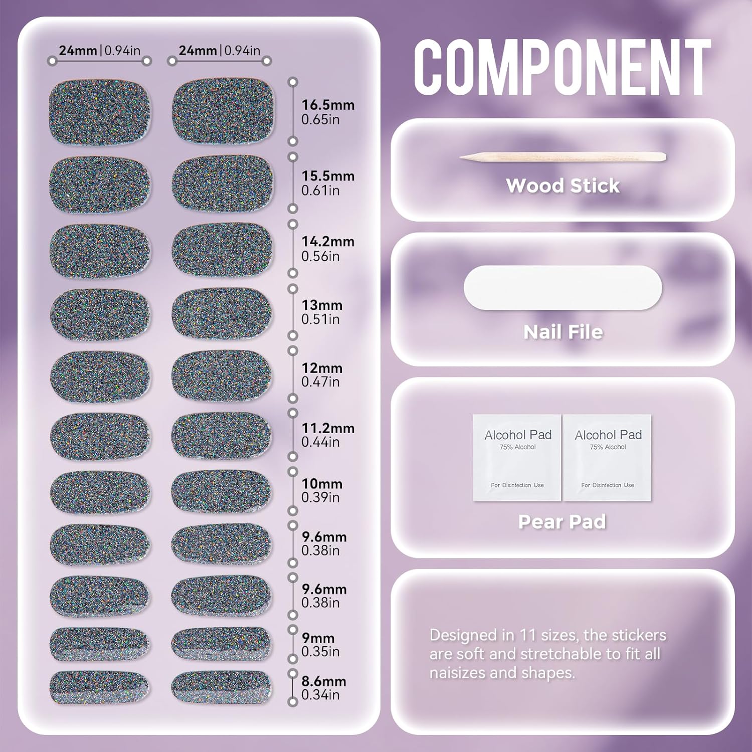 - 【Gel Nail Sticker Set】This no-bake gel nail sticker set includes 22 pcs of gel nail stickers in 11 distinct sizes, along with 2 preparation pads,a nail file,and a wooden stick