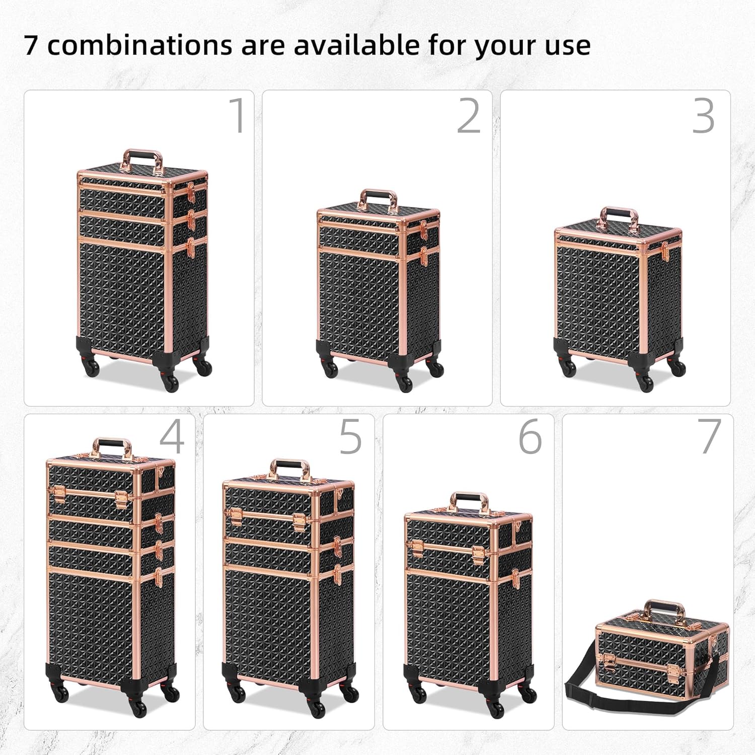 - 【Bonus Lid for Added Convenience:】The rolling makeup case is included a bonus lid that allows you to transform the portable makeup box into a standalone first layer. This means you have 7 different storage layer combinations at your fingertips, providing the ultimate versatility and organization for your beauty essentials.