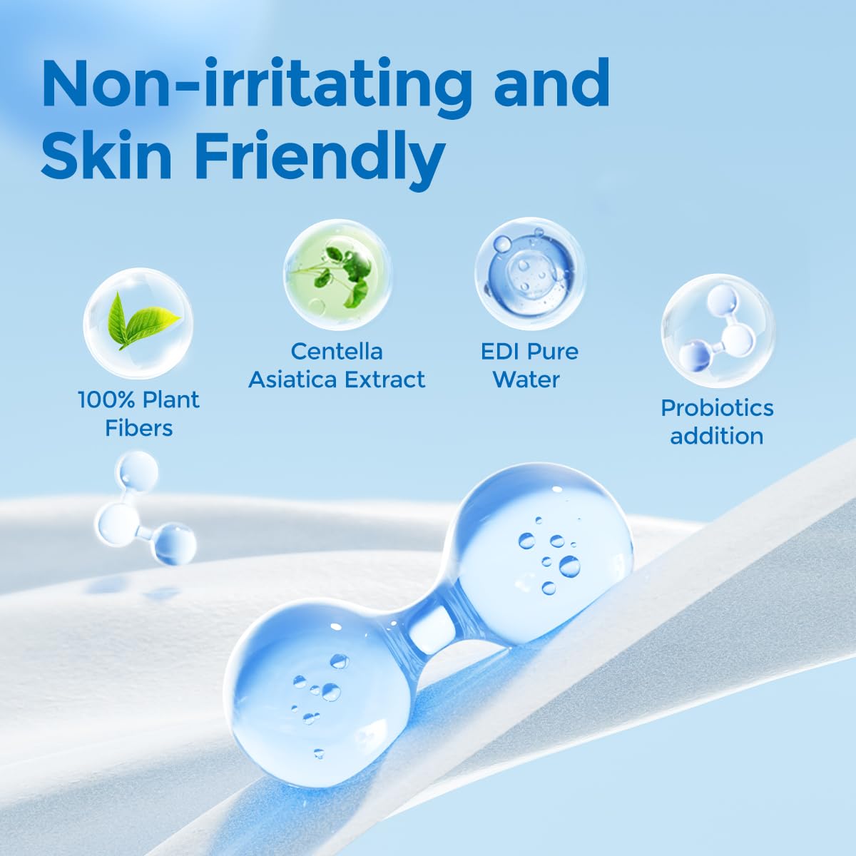 - 【Mild Formula】 Our flushable wet wipes are crafted with a mild and skin-friendly formula, containing 99% pure water to provide a refreshing yet gentle and non-irritating clean. These wipes with probiotics(for skin care, not for medical purpose) and Centella Asiatica extract are free from alcohol, fragrances, and harsh chemicals, making them suitable for sensitive skin.