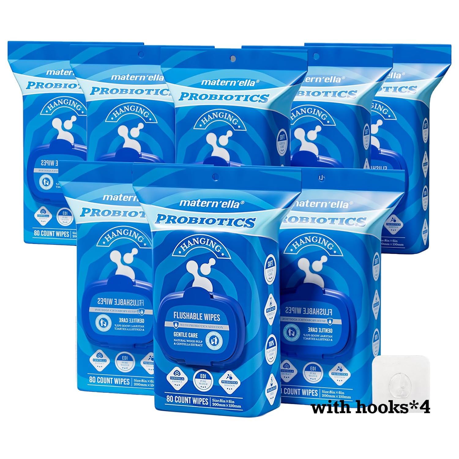 matern'ella Hanging Flushable Wipes Unscented Extra Large Corner-Connected Wet Wipes Adult Plant Based Fibers with Probiotics Alcohol Free Sewer Safe Butt Wipes Travel 8 Packs 640 Wipes