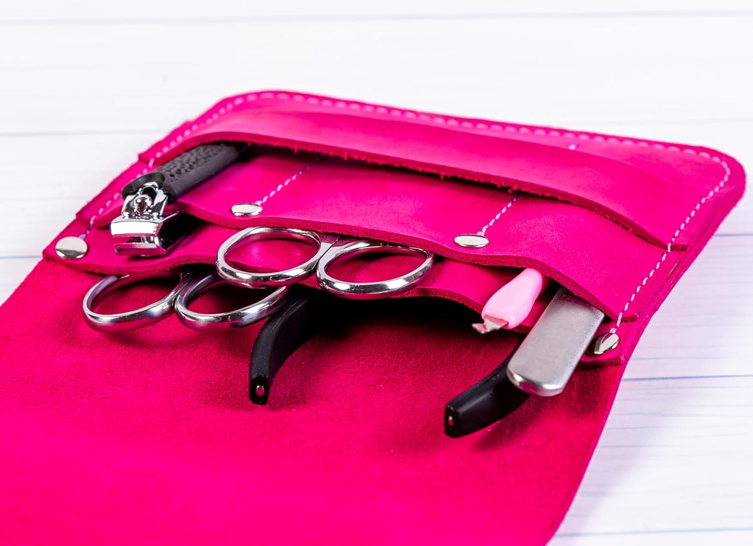 - This leather manicure case is perfect accessory for anyone who wants to keep nail tools organized, safe and handy. Manicure tool pouch is great for any occasion – to use at home, while travelling or camping, as a gift for partner, family member, and friend.