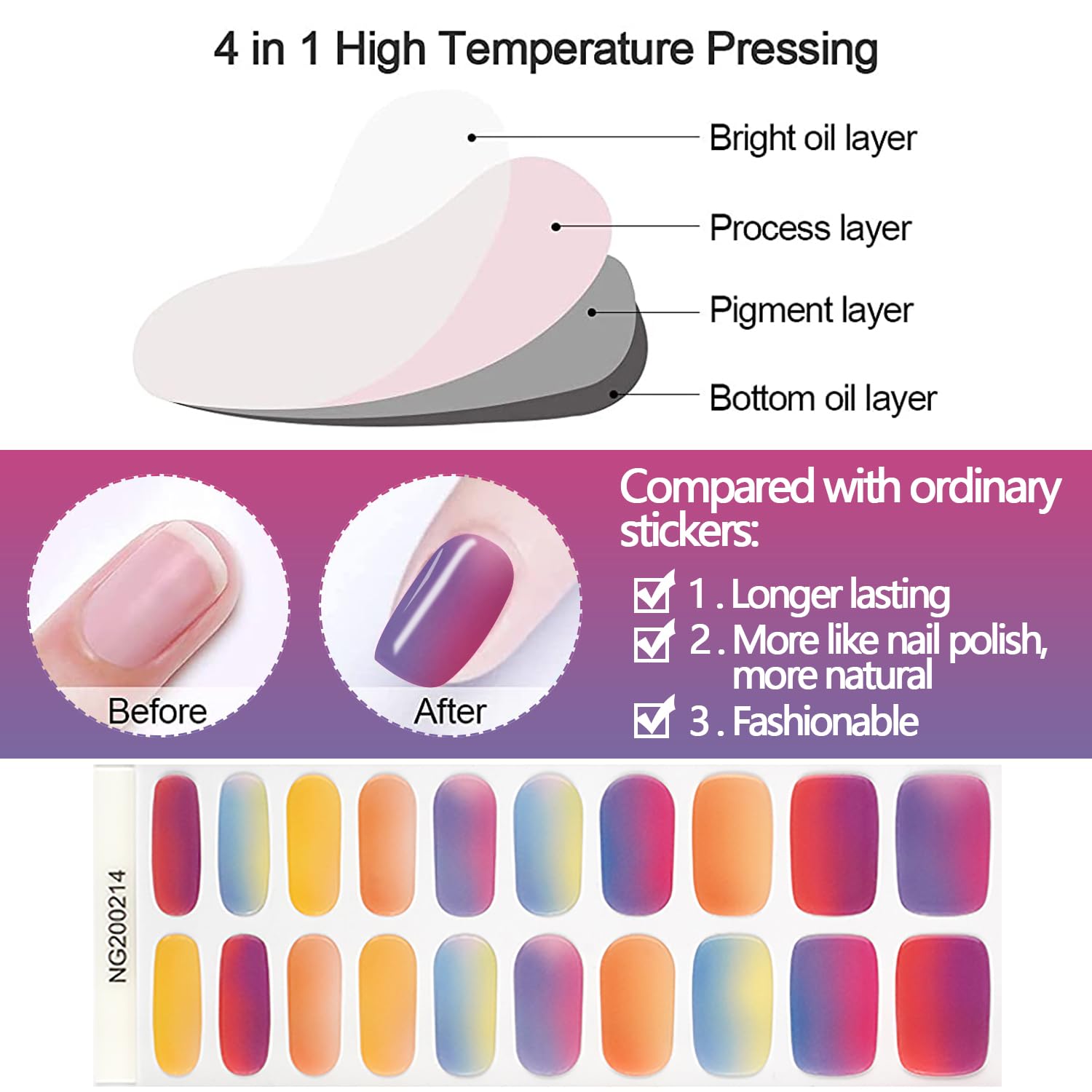 WOKOTO 20 Pcs Gradient Semi Cured Gel Nail Strips With Nail File & Wooden Stick Semicured Nail Polish Strips For Women Girls Gel Nail Wraps Uv Light Gel Nail Stickers Stick On Nails Gel Stickers