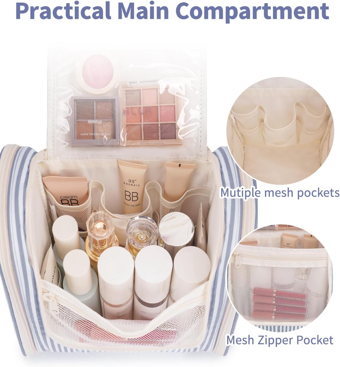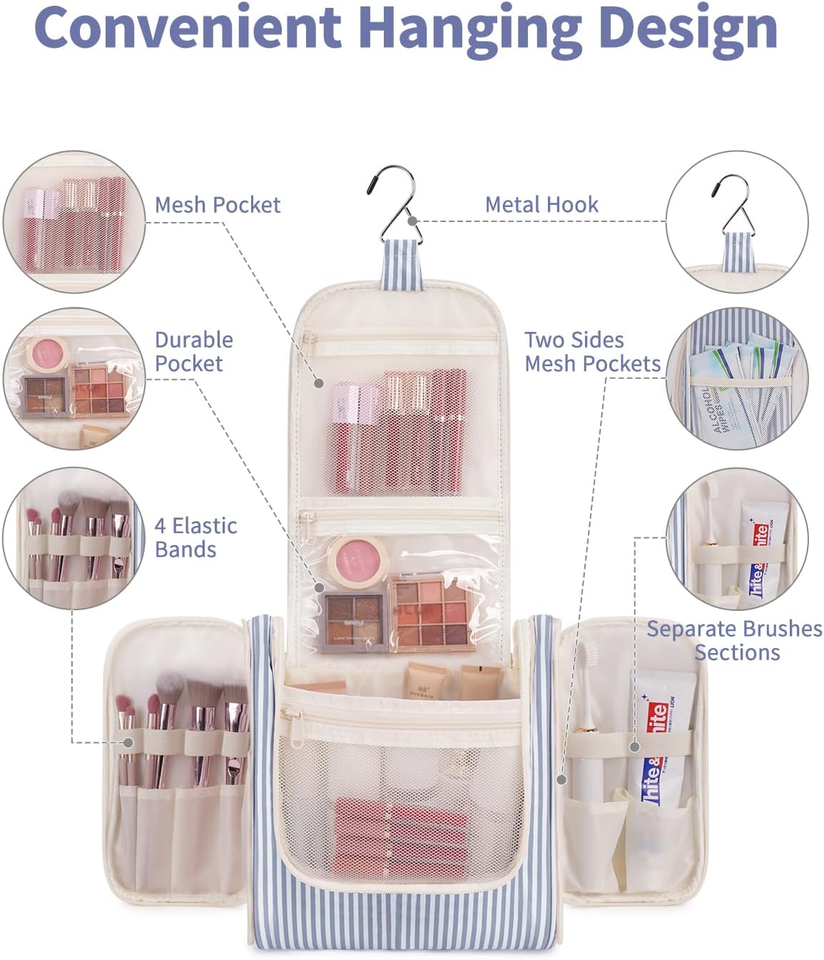 Narwey Striped Hanging Travel Toiletry Bag for Women, Travel Bag for Toiletries, Makeup Bag Organizer Cosmetic Bags Make Up Bags for Women (Greyish Blue Stripe)