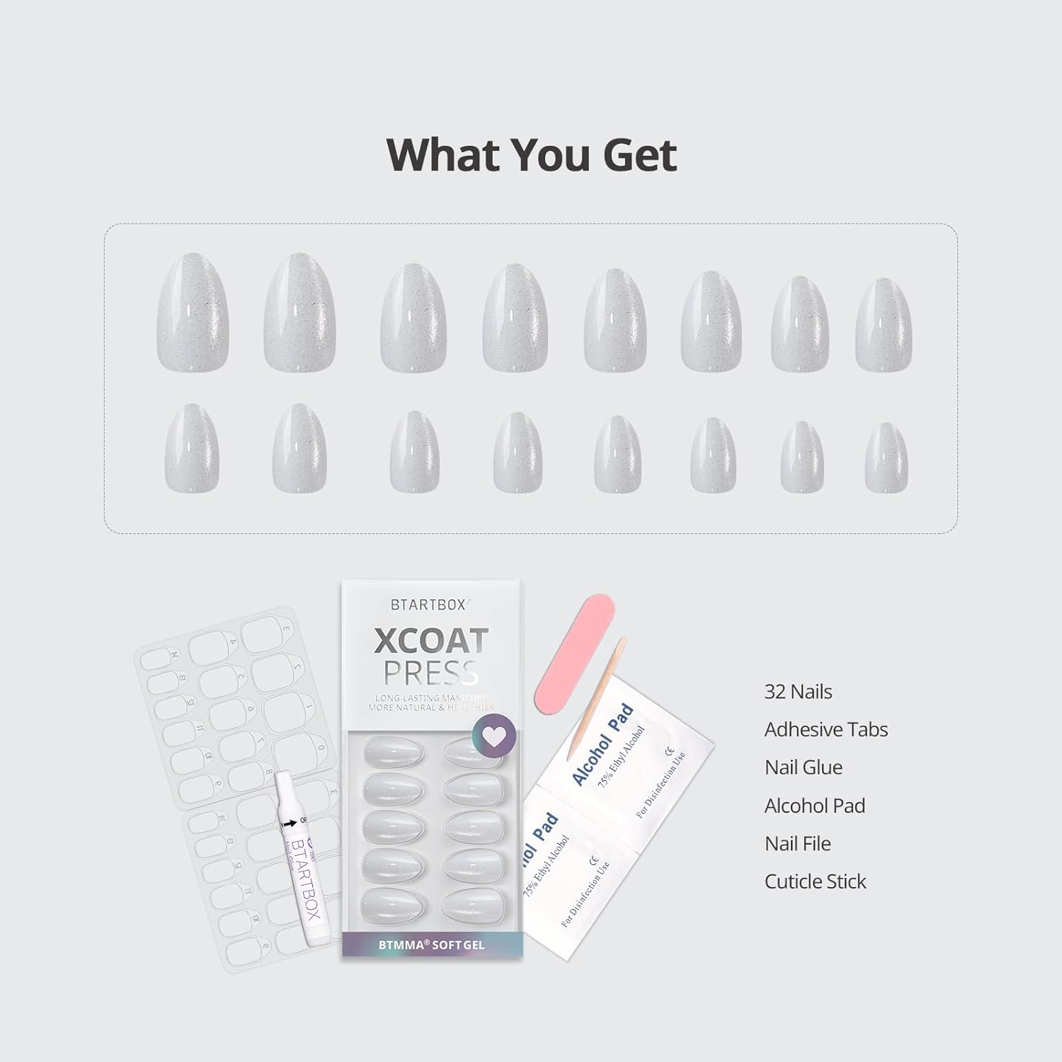 BTArtbox Press On Nails Short - Lamp-Curable White Cat Eye Almond Press On Nails with Glue for Women, Semi-Transparent Soft Gel Glue On Nails in 16 Sizes - 32 Stick On Nails Kit, Whitecaps