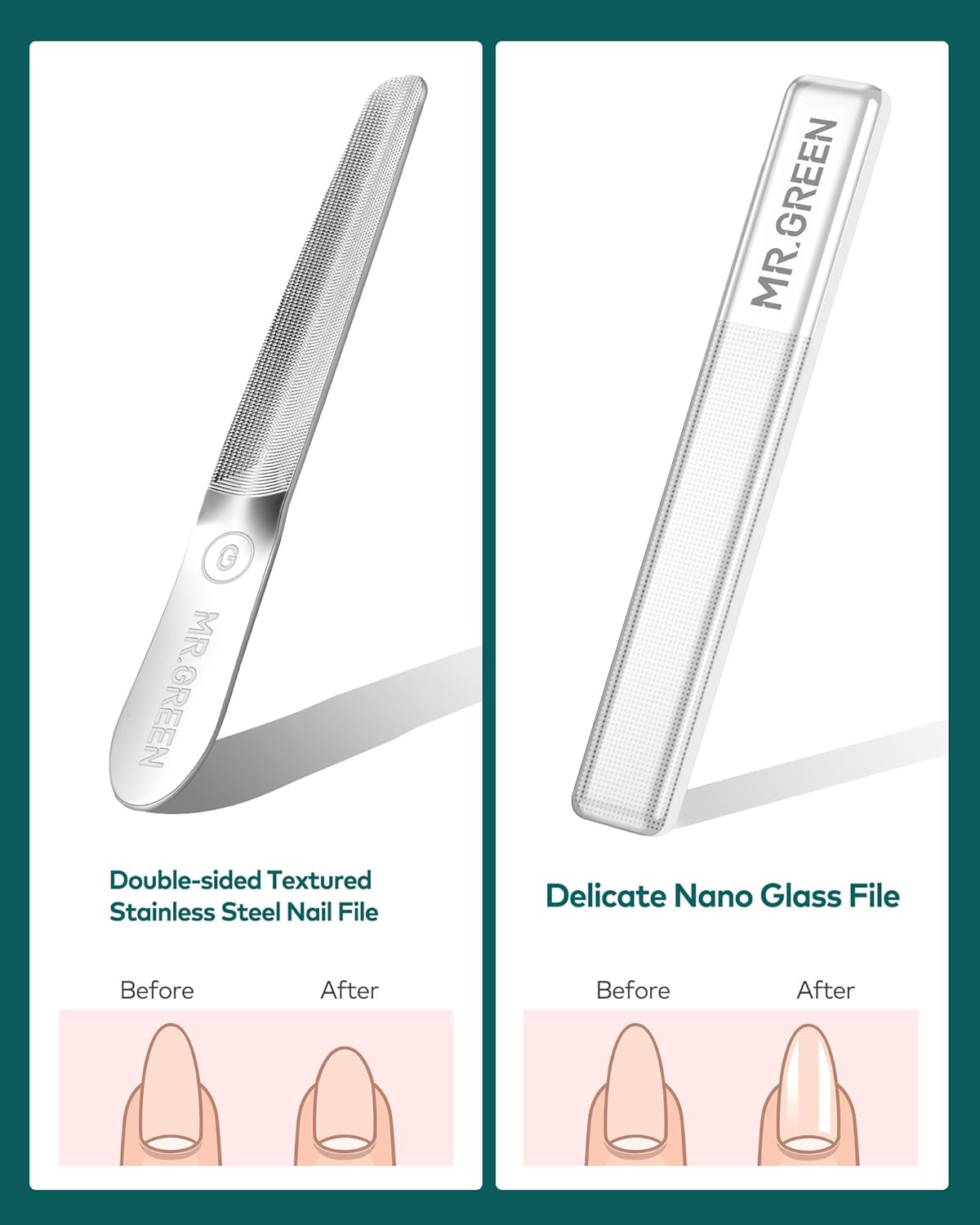 - 【10 PCS Manicure Set】Professional manicure set includes nail clipper/ beveled nail clipper/ thick nail clipper/ nose hair clipper/ tweezers/ ear wax remover/ V-shaped push stick/ nail dirt remover/ glass polishing file/ nail file. Super convenient nail care kit, Mr. Green's selection of handy kits eliminates the need to pay for a single nail clipper or facial tool!