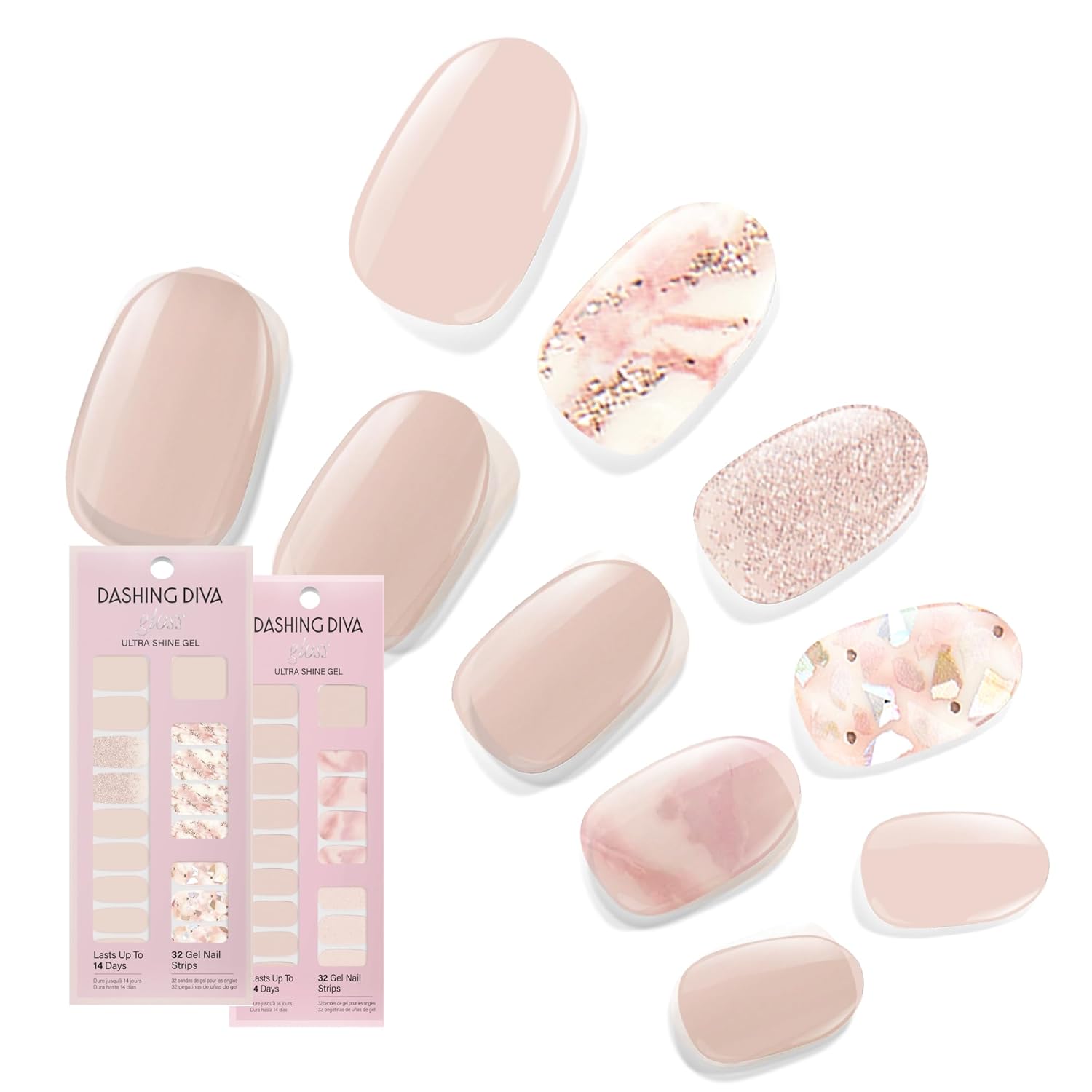 - Includes: 2 x Gel Strip Sets. Each set includes 32 gel manicure strips (20 base color, 12 accent), 1 prep pad, 1 nail file. Easily remove nail strips with nail oil or acetone