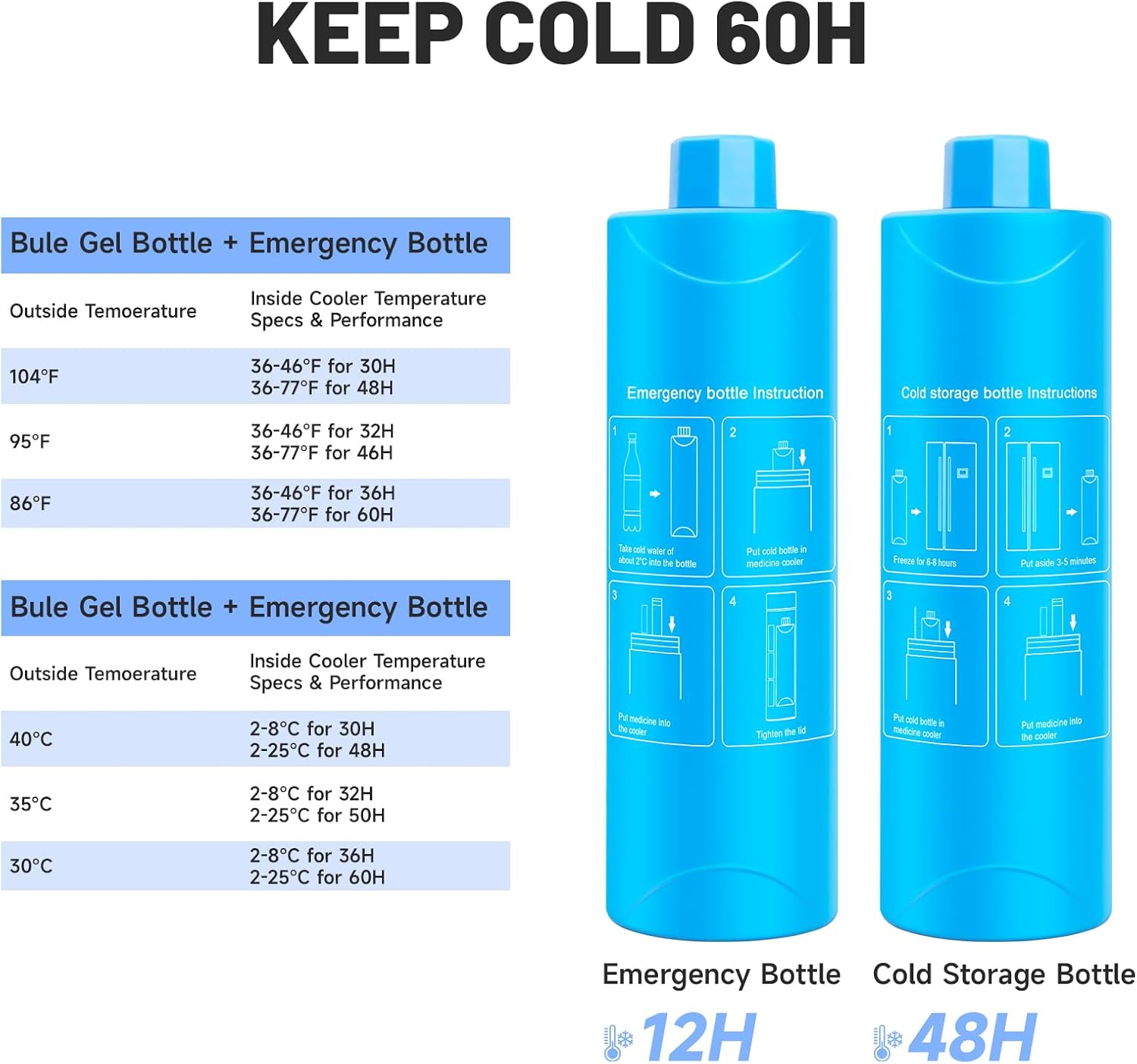 - Keep Your Medicine Cool Up To 60 Hours: Our pen cooler uses advanced double-layer vacuum insulation, gel packs and ice water bottle to maintain refrigerator-like temperatures for at least 34 hours, even in extreme conditions up to 104°F (40°C). In 86°F (30°C) environments, it can stay cool for up to 48 hours. By adding an ice water bottle, you can extend the cooling duration to a total of 60 hours.