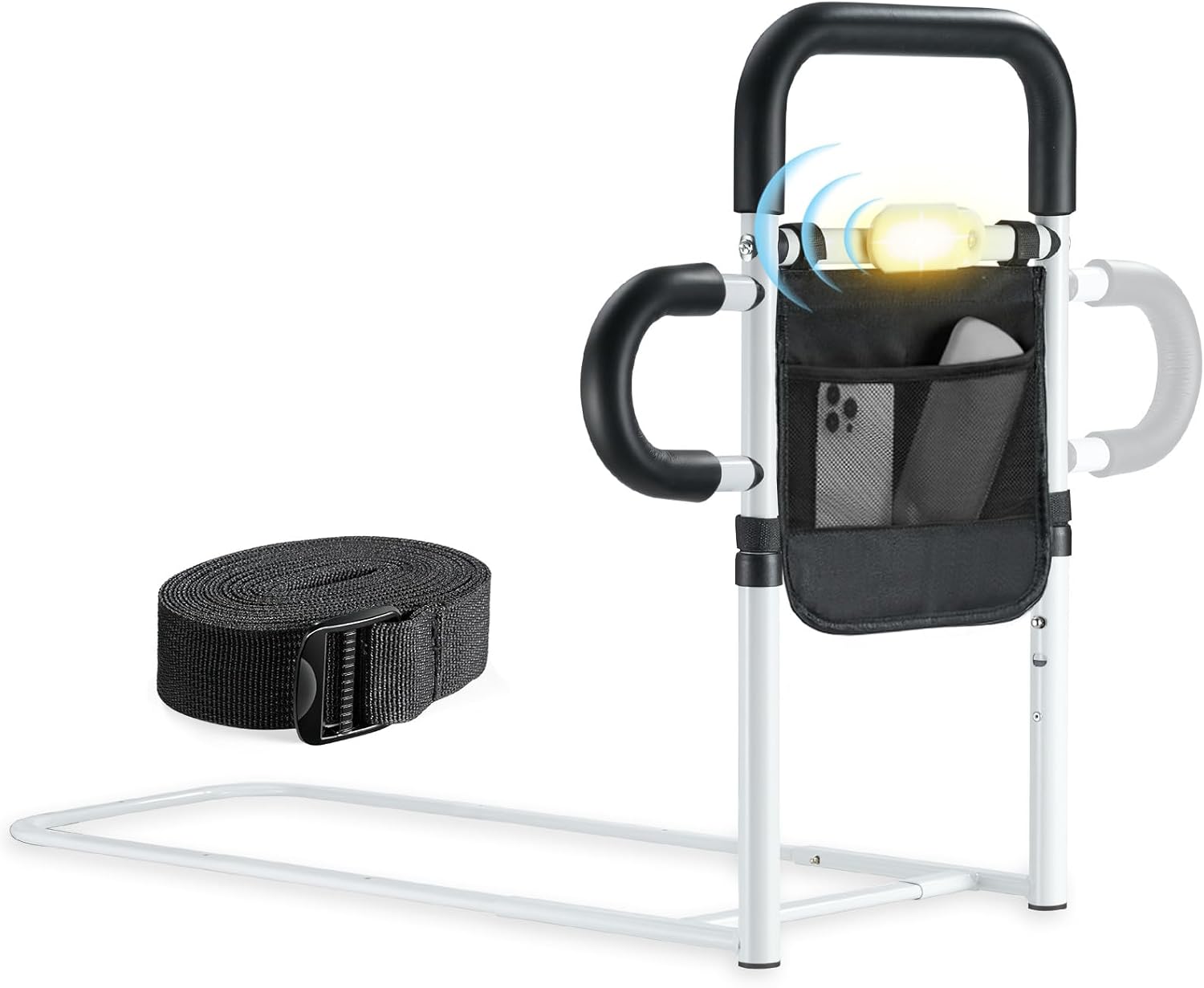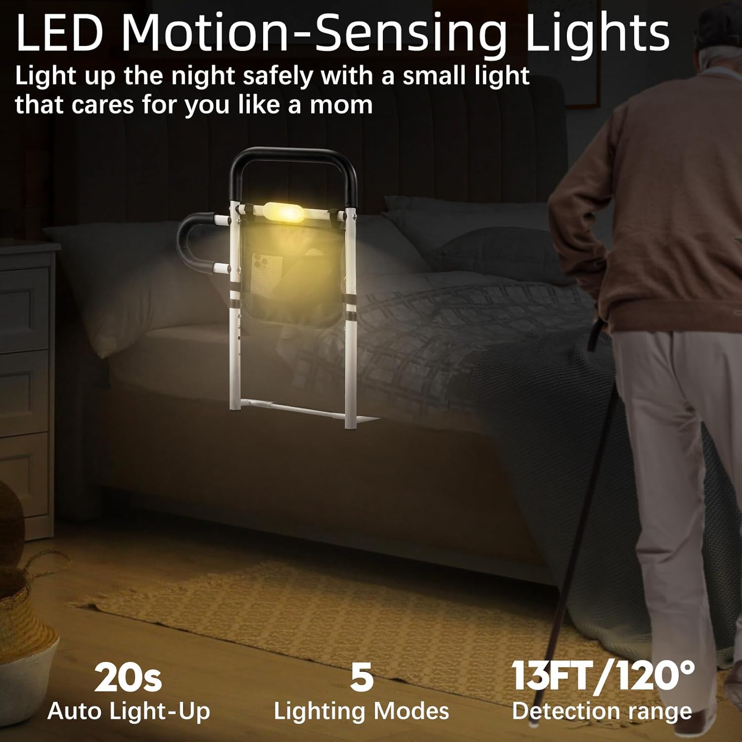 - 【NIGHT-TIME SAFETY】The LED sensor light on the pocket of the bed assist rails for seniors provides illumination when the lights are out. The bed side rails have side grip rails that can be mounted on either the left or right to provide convenient direction for hands