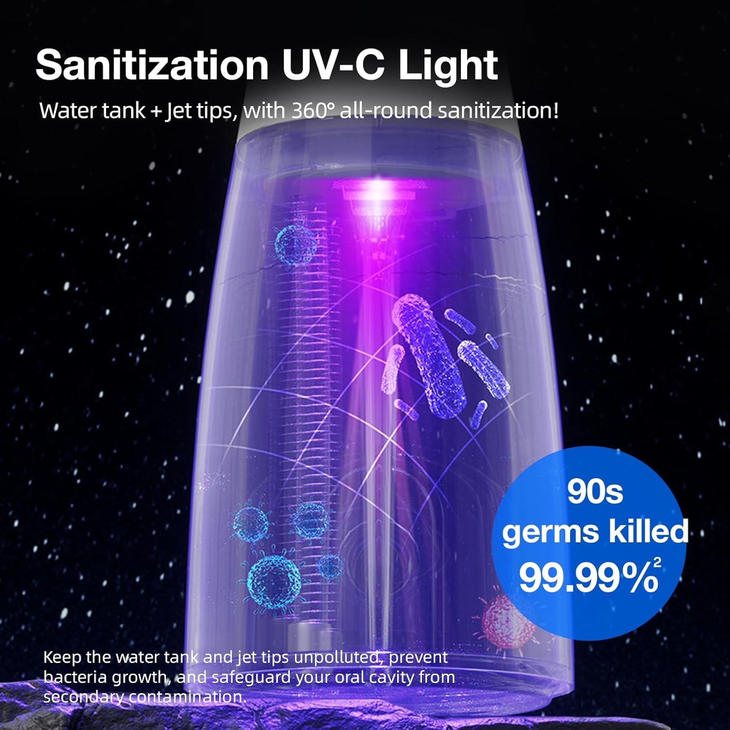 - Advanced UV-C Sanitization for Superior Hygiene – Built-in 360° UV-C light sterilizes the tank, pipes, and tips after every use, ensuring a clean and bacteria-free oral care routine. Smart 90-second timer for effective flossing every time.