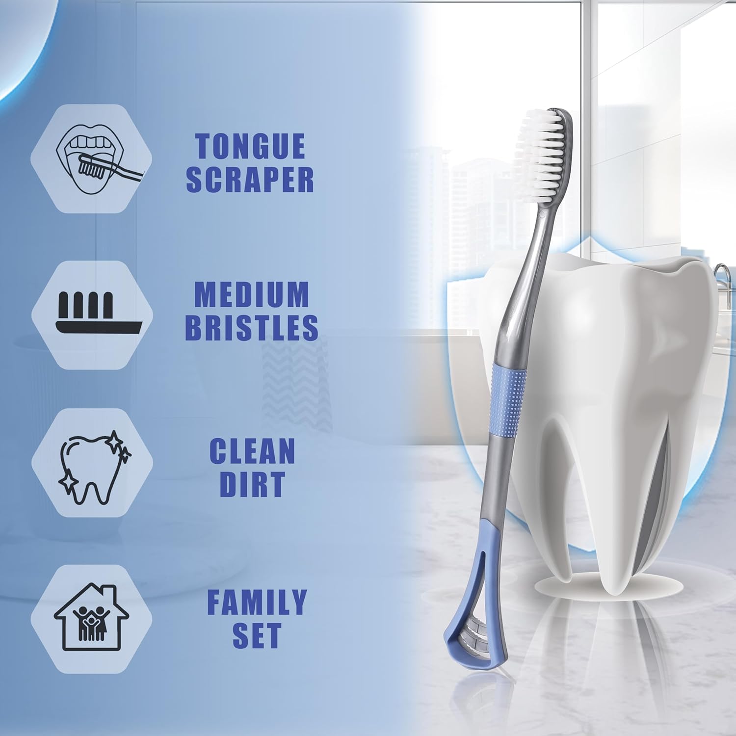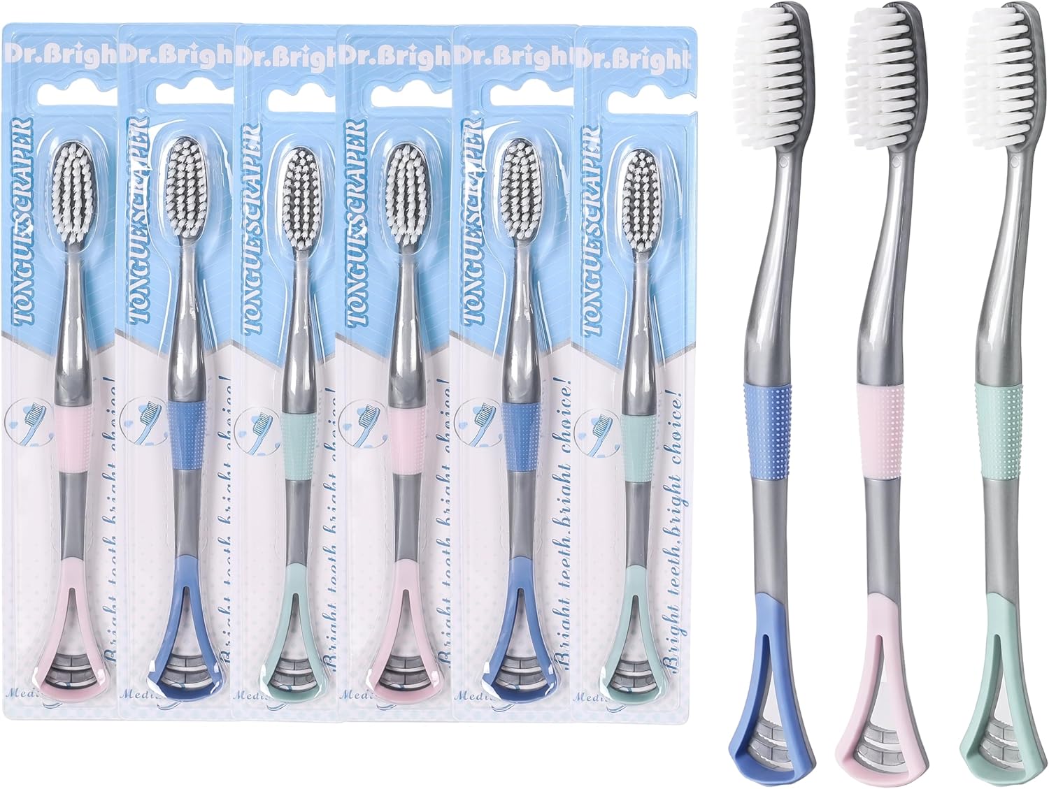 2IN1 Toothbrush Medium with Tongue Scraper, Medium Toothbrushes for Adults, Travel Toothbrushes with Ergonomic Handle, Assorted Colors, 6 Pack