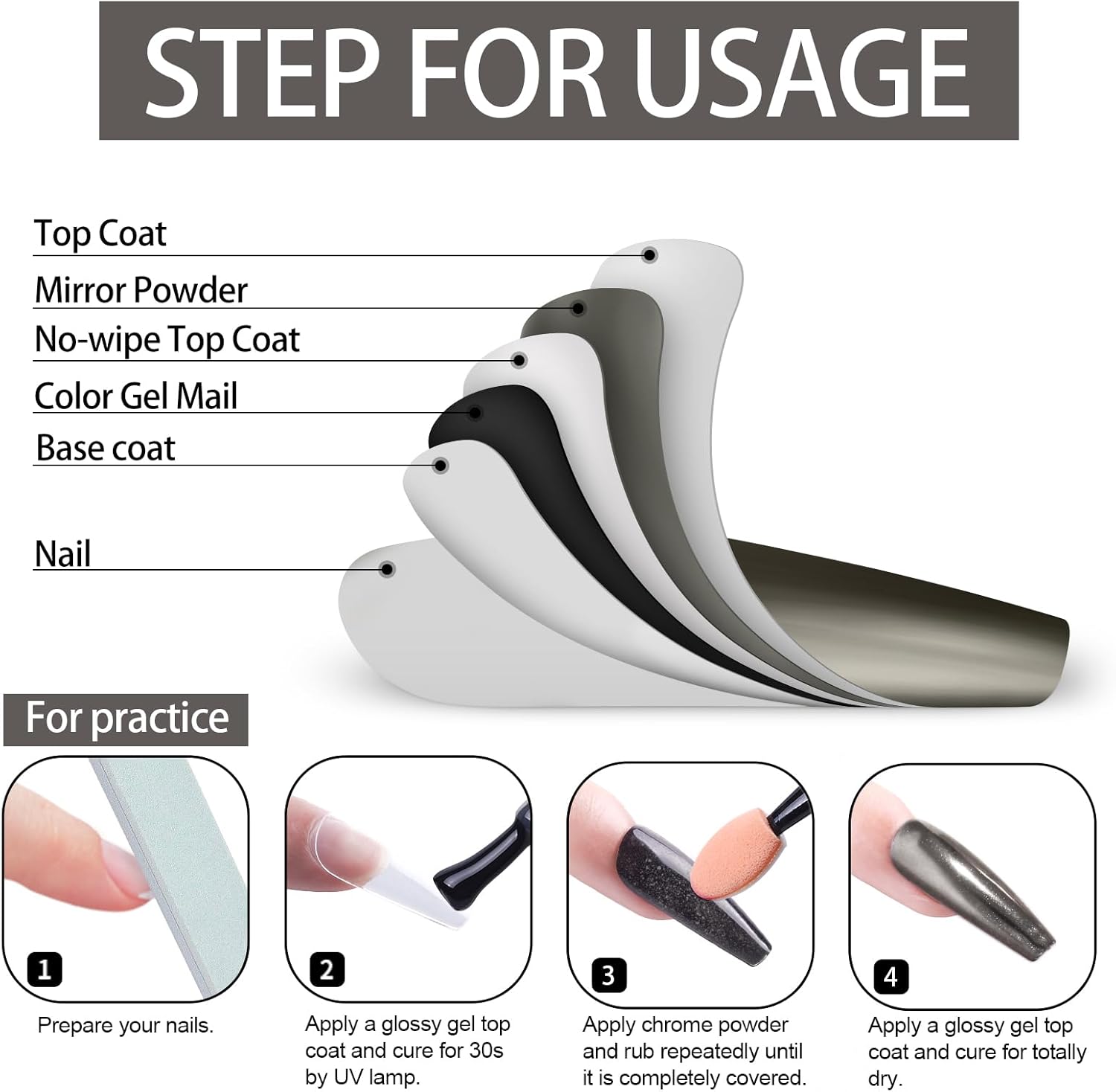 - PACKAGE CONTENTS:1 PCS chrome nail mirror pigment powders. It needs to be used with gel nail polish and no wipe top coat. They can make many different design for your gel nail polish. It gives different color base a pearly shine for your nails