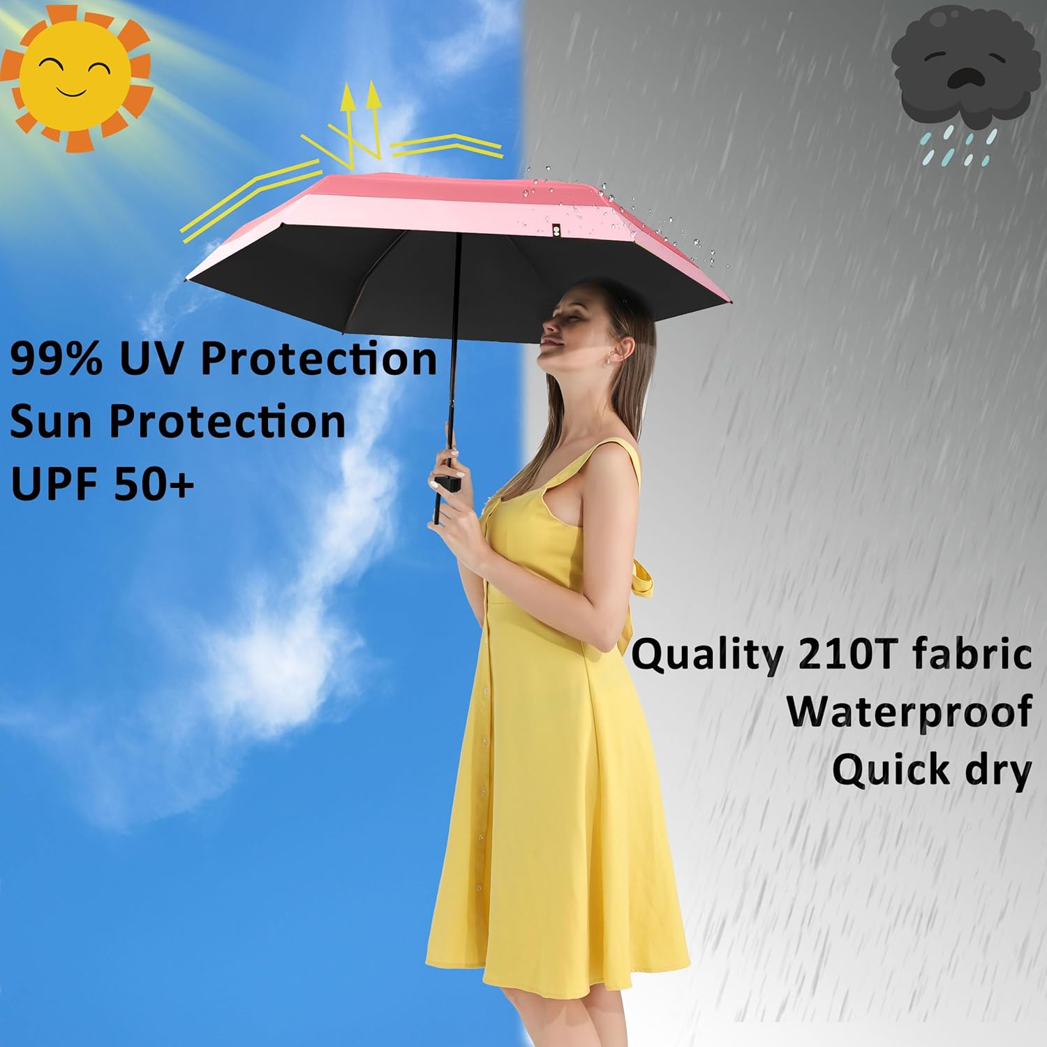 - Pocket umbrella: With a 40-inch arc and a 35.4-inch diameter, this mini travel umbrella is perfect for concealing in your purse or bag when you’re on the go! Folds to an ultra-compact 7.9 inches, makes the umbrella great for travel, as this super lightweight umbrella collapses about the size of your palm