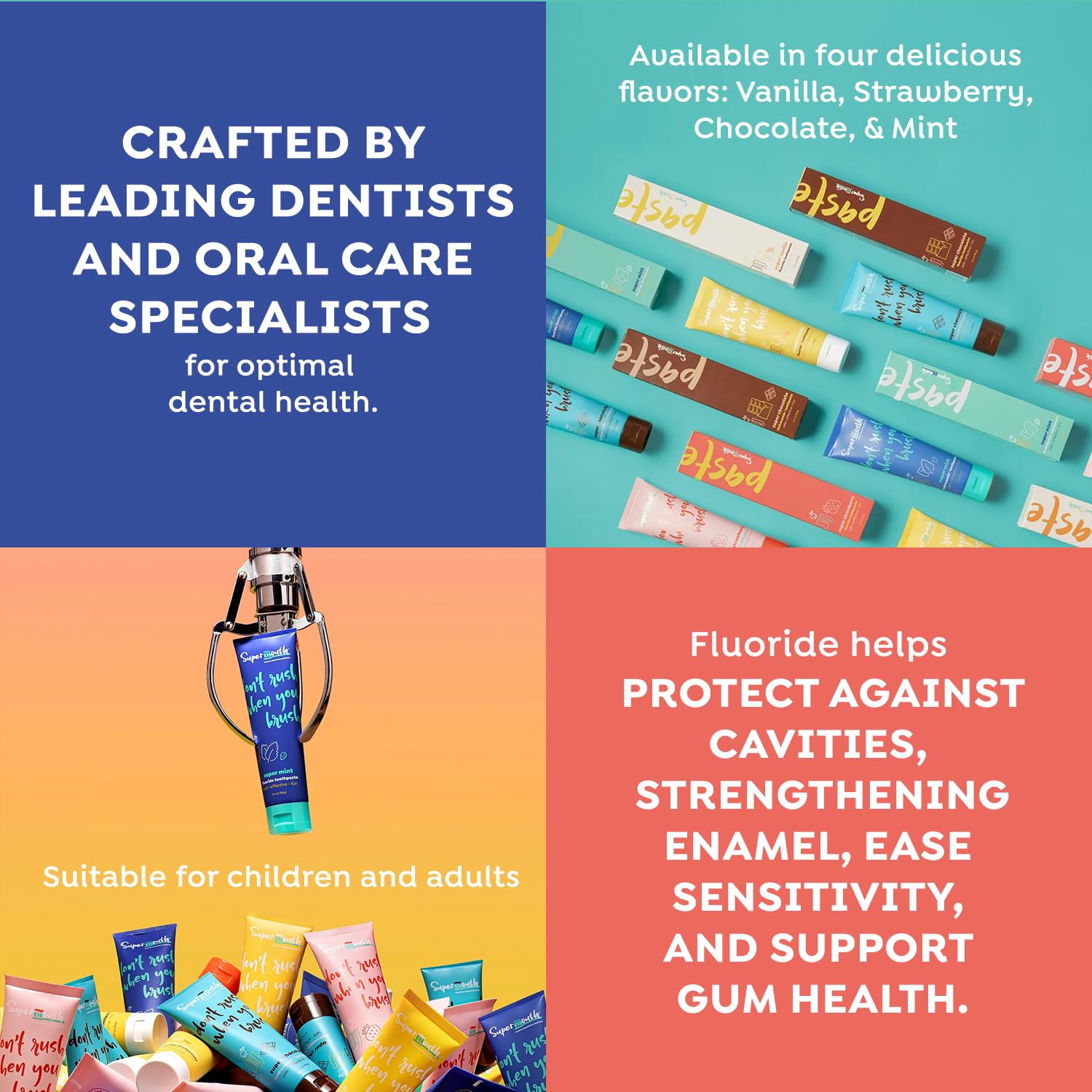 - Delicious Flavors that Make Brushing Enjoyable: Turn daily brushing into a treat with four family-favorite flavors—Smooth Vanilla, Creamy Strawberry, Decadent Chocolate, and Fresh Mint. Our specially formulated spearmint avoids the burning sensation or aftertaste often linked to peppermint oils, delivering a refreshing but gentle experience that encourages consistent brushing for kids and adults alike.