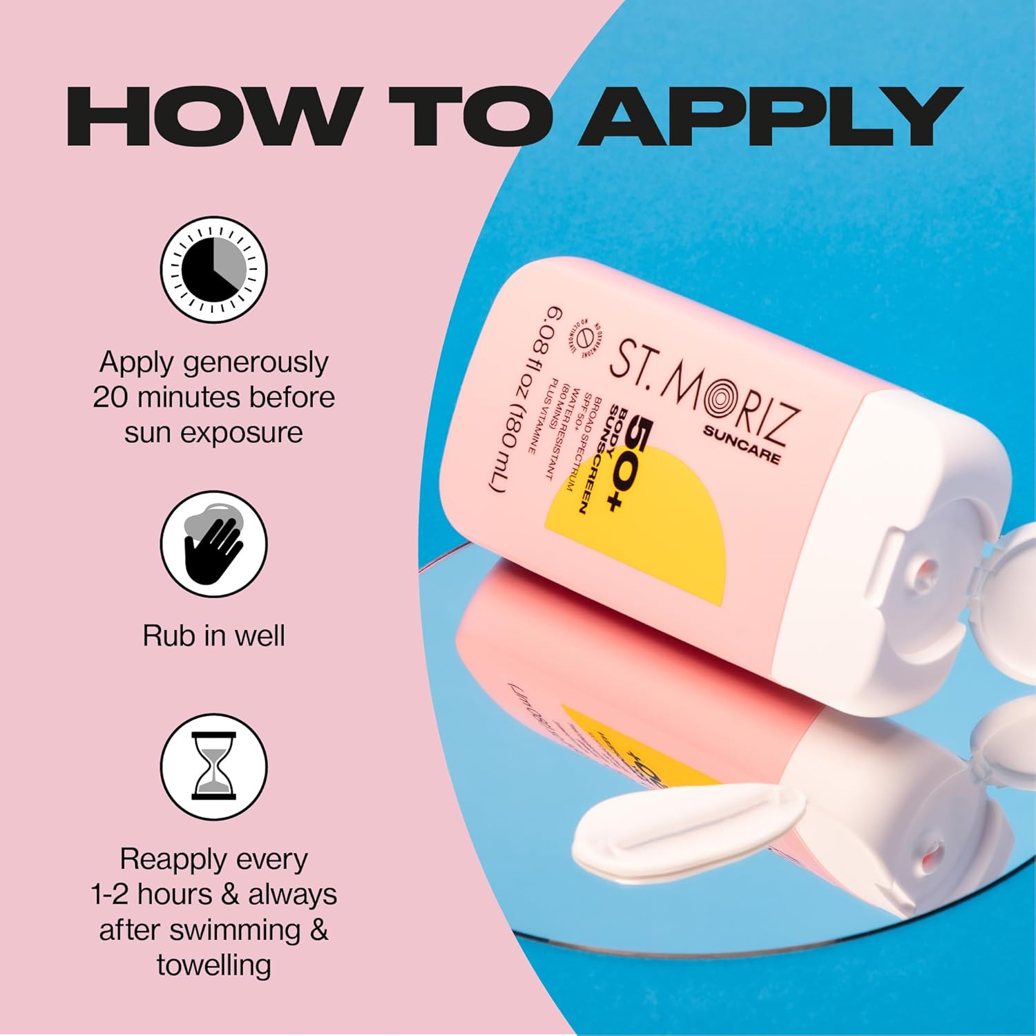 - HOW TO USE: Apply liberally 15 minutes before sun exposure. Reapply: After 80 minutes of swimming or sweating. Immediately after towel drying. At least every 2 hours.Being safe in the sun shouldn't be boring! Our daily use, broad spectrum protection formulas combine sunscreen & skincare to future-proof your skin! Use St. Moriz Suncare alongside St. Moriz Self Tan for a sun safe glow.