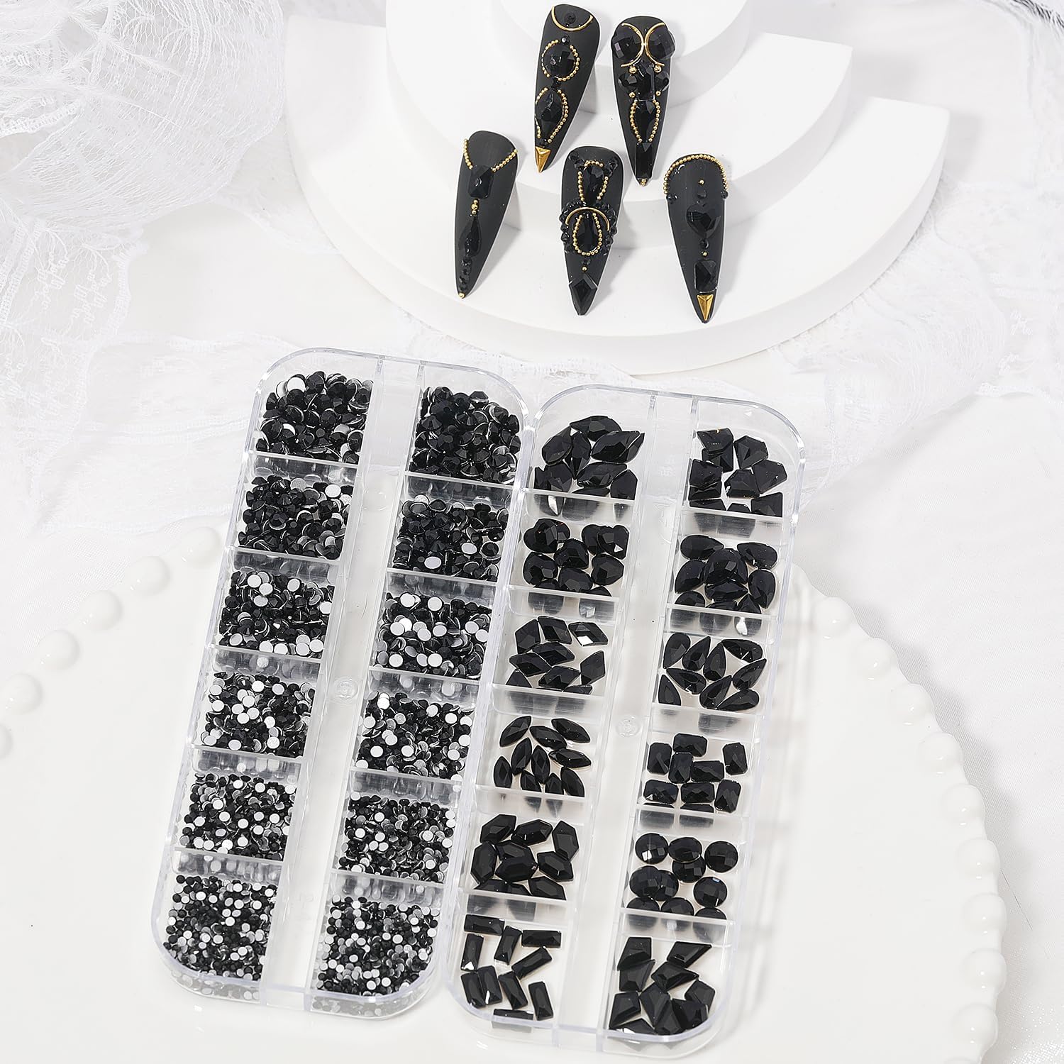 - ★Multi sized - Black for nails decorations accessories are perfect for creating 3d nail Art or decorating jewelry, makeup, body Art, diy crafts, wedding dress or shoes, cell phone cases, glasses, greeting cards, bags, guitars, scrapbooks, etc., the mixture of different sizes makes it easier to achieve different designs of nail art,which add sparkle and glamour to your crafts.