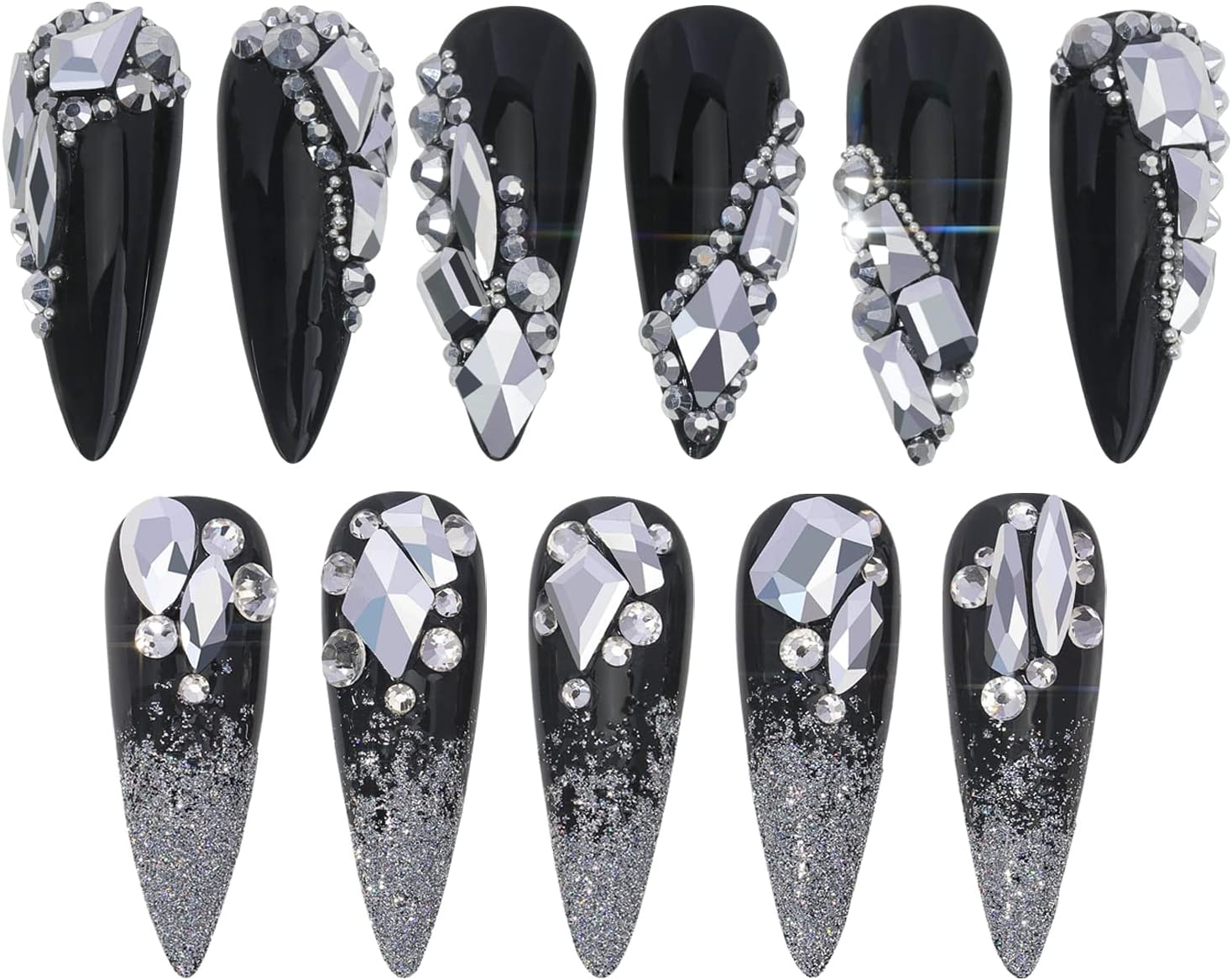 Nail Rhinestones - 3D Multi Shape Size, Flat Back, Manicure Rhinestones Charms, Crystal Silver Gems, with Kit, for Nail Art, Bedazzling Acrylic Nails, DIY Decor