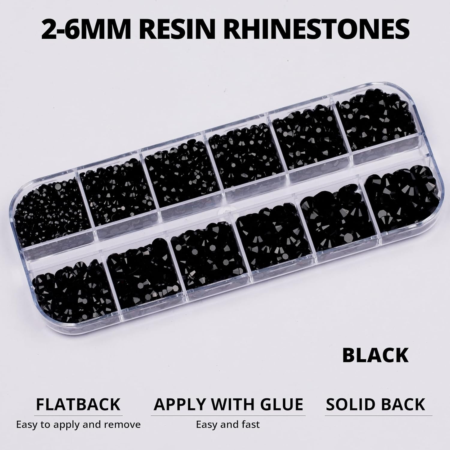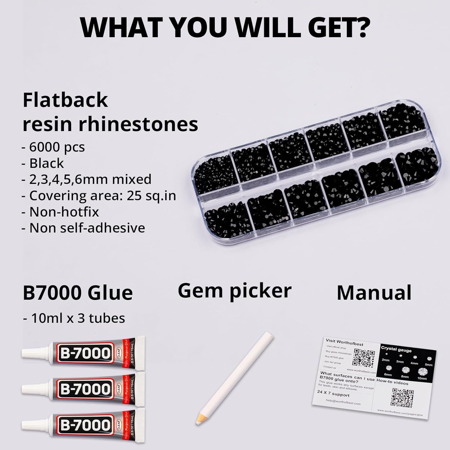 6000Pcs Black Rhinestones for Crafting Bedazzling with b 7000 Jewelry Glue, Resin Flatback Crystal Diamond for Crafts Clothing Clothes Project Dress, Flat Back Bedazzler Half Gems Multiple Sizes