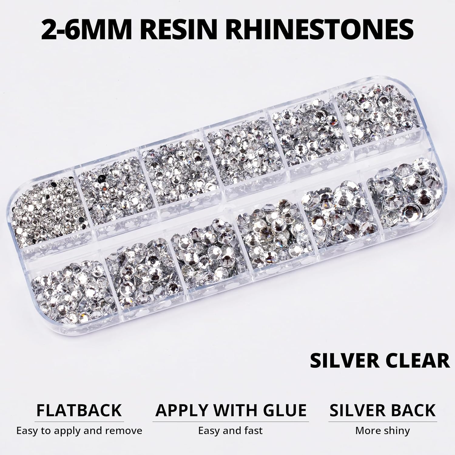 Resin Rhinestones for Crafting Bedazzling with b7000 Glue, 6000Pcs Silver Clear Flatback Gems Crystal for Crafts Clothing Clothes Shoes Nails Makeup, Flat Back Jewels Diamonds Rinestones Set Mix Sizes