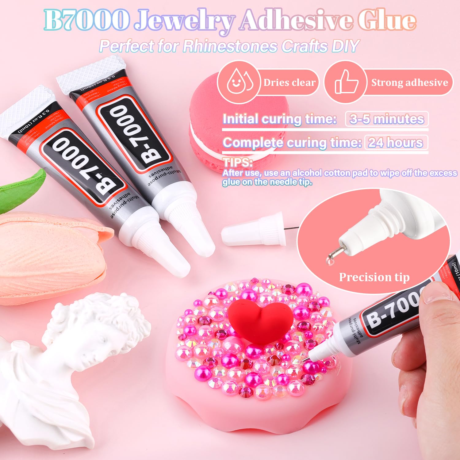 - B7000 CLEAR GLUE FOR GEMS -- Strong adhesion and dries clear, precision needle for easy application. The initial cure time is 3-5 minutes and the full cure time is 24 hours. After use, the needle should to be wiped with an alcohol pad